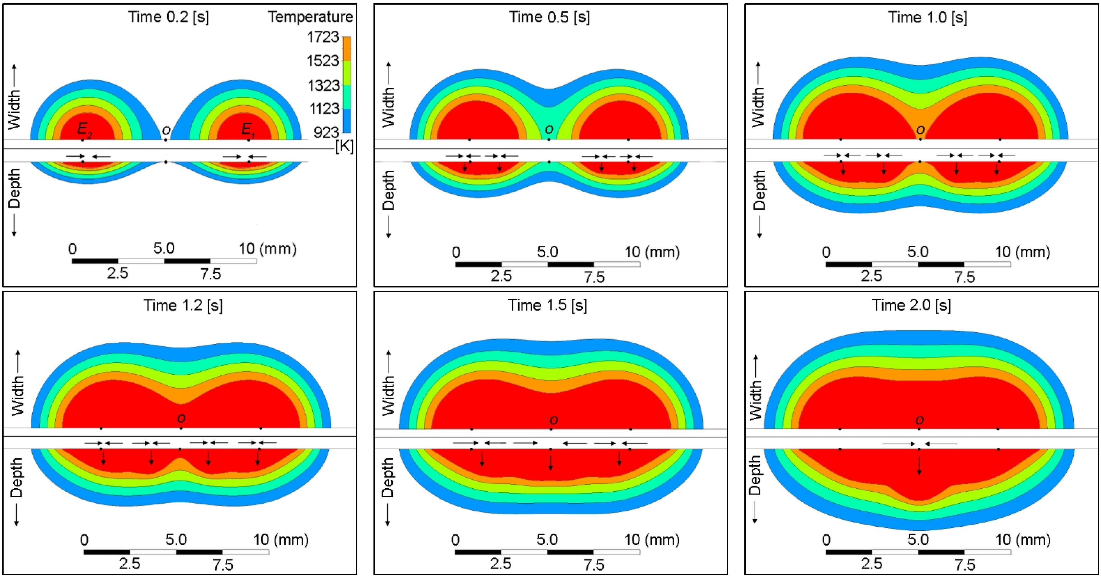 -shaped pool was observed. Because of the Marangoni convection, the velocity vectors were directed inward on the surfaces of both molten pools. The pools started to merge after 1.0 s. As they began to reach the critical temperature, the velocity vectors changed direction, and the opposing vectors converged at o. The direction shifted downward, resulting in a deeper pool, as illustrated in the figure at time 2.0 s. The small arrows in each figure clarify this phenomenon. The maximum pool depth and width were 2.9 mm and 13.6 mm, respectively.5.3. The Moving Weld Pools