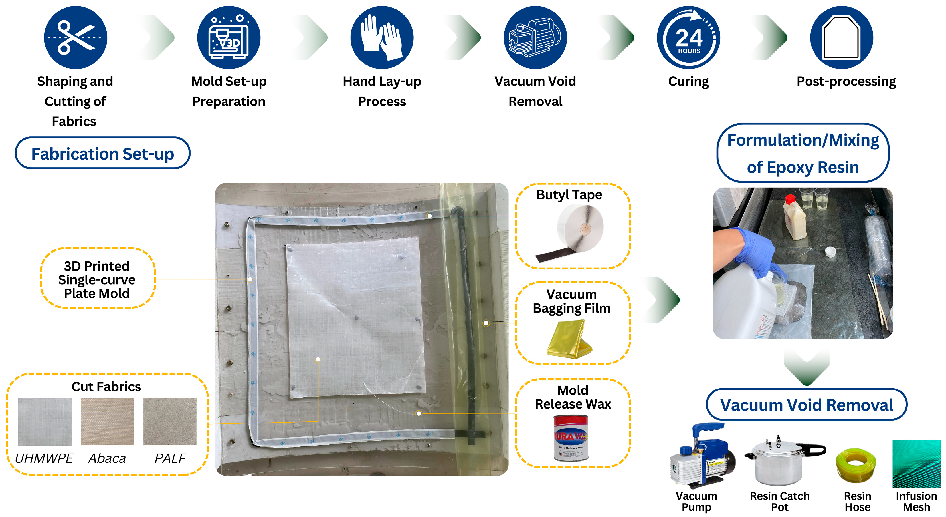 - Oyales, M.-I.K.; Sirot, R.; Matilac, L.; Punongbayan, A.J.; Bonete, R.; Magdaluyo, E. Numerical and Experimental Fractographic Analysis of Fiber-Reinforced Ballistic Composites with and Without Additional Absorber Layer. In Proceedings of the 9th International Conference on Fracture of Polymers, Composites & Adhesives, Les Diablerets, Switzerland, 24–27 March 2024; p. 29. [Google Scholar]