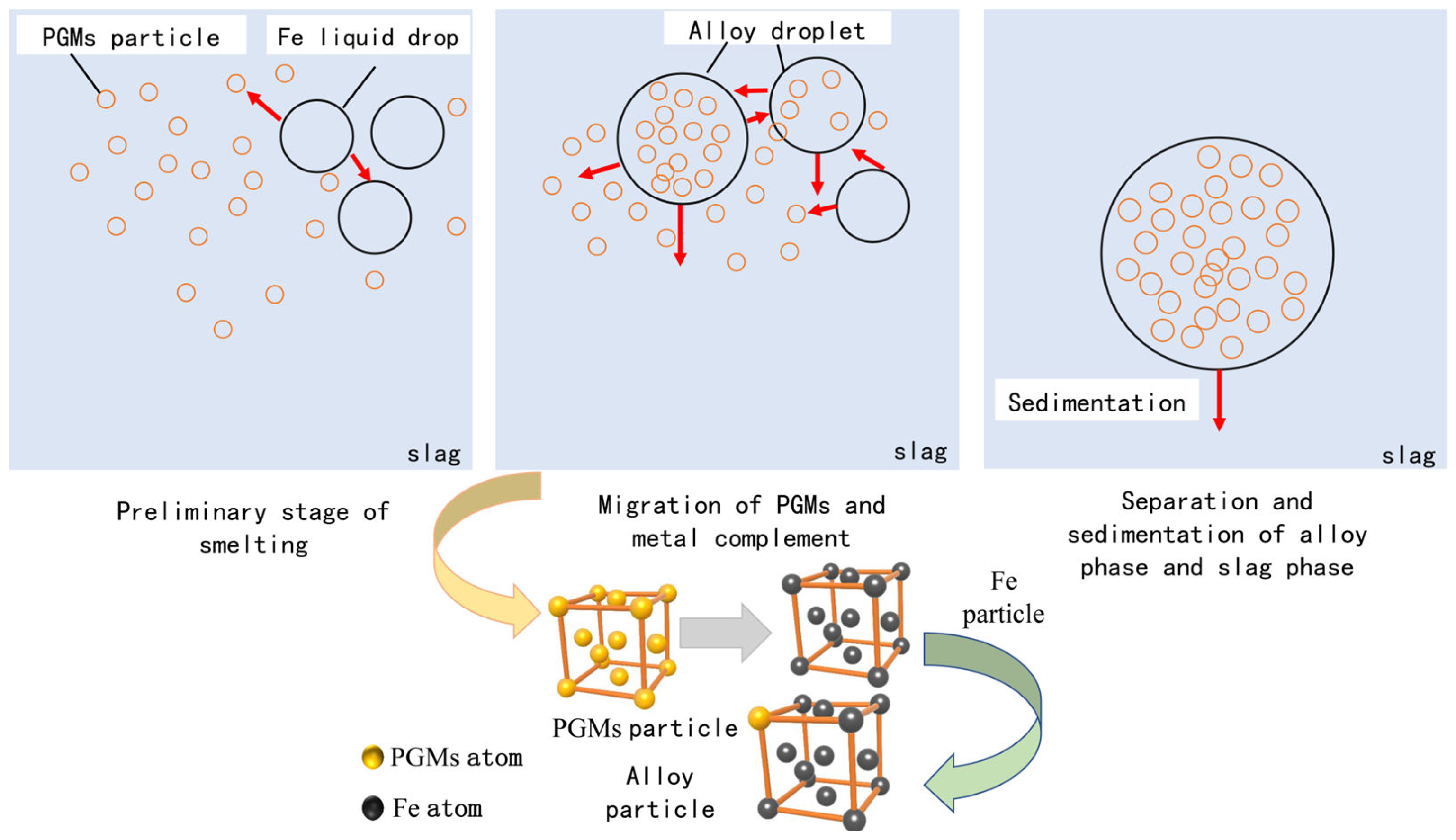 - With the addition of collectors, PGMs tend to migrate toward the iron phase driven by interfacial energy. They are subsequently captured, resulting in the formation of alloy droplets with a platinum group metal (PGM) content exceeding 4 wt.%. Over time, these droplets undergo aggregation, growth, and ultimately settle and separate.