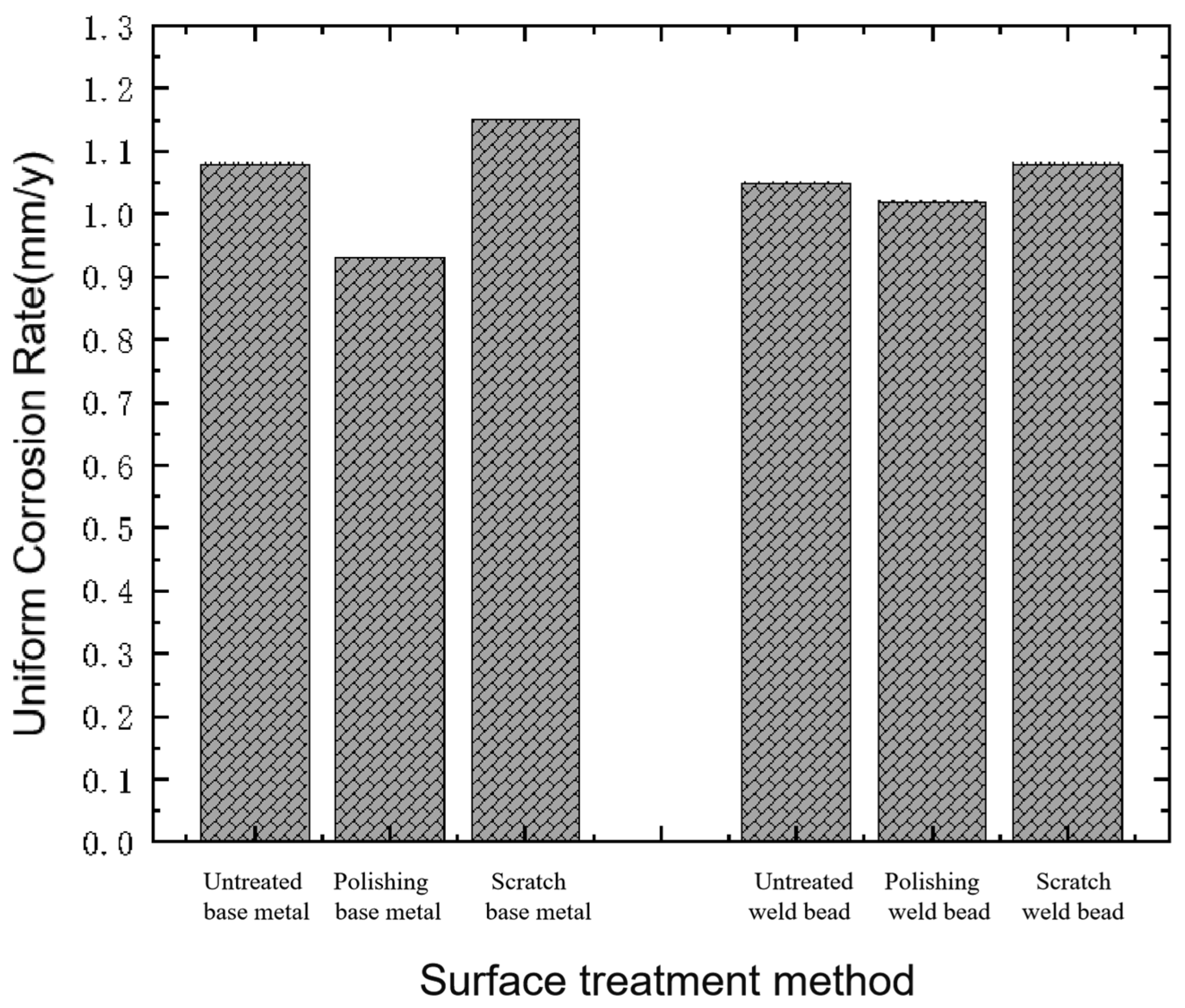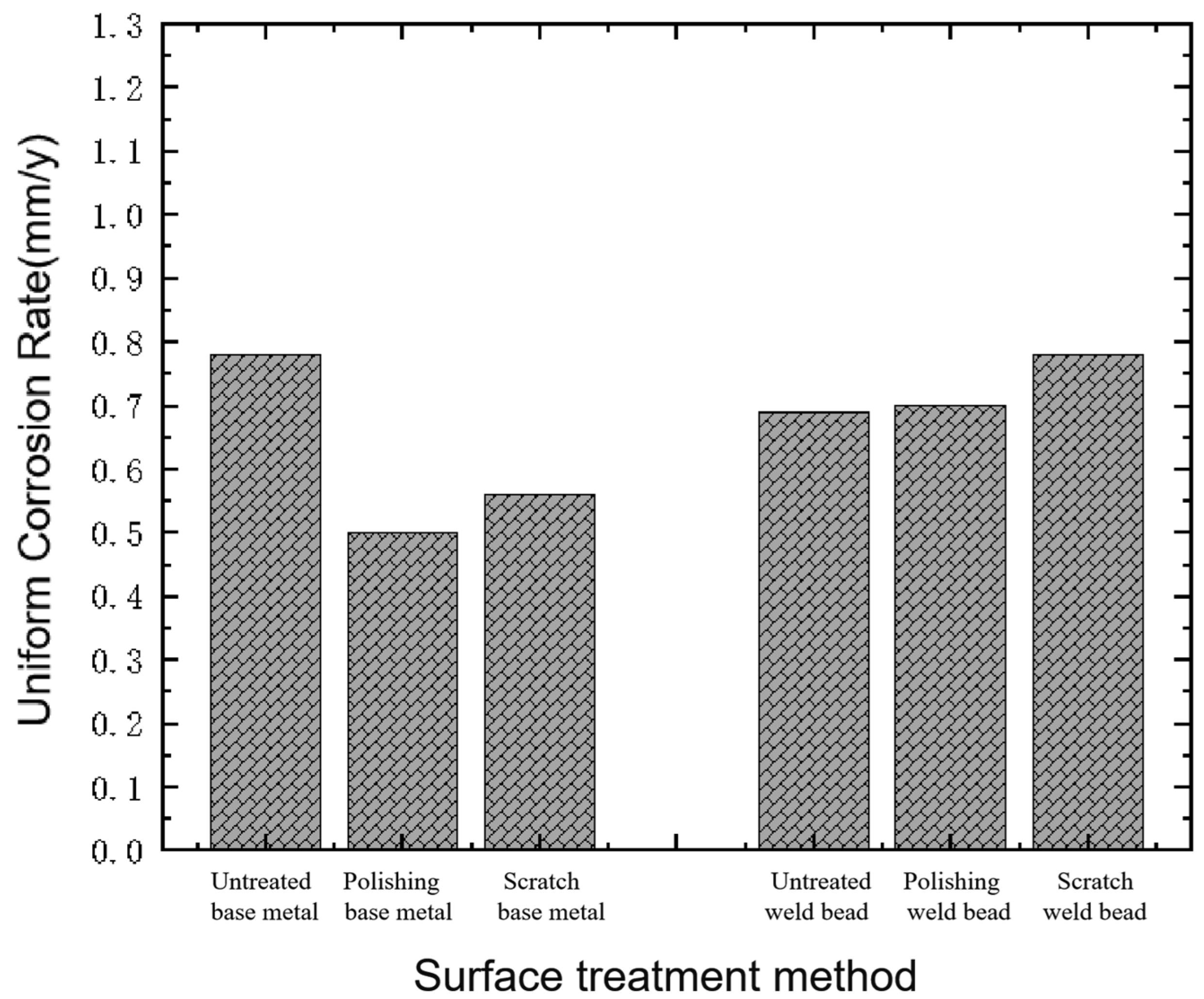- By comparing the uniform corrosion rates, it is found that under the quality of production water, the uniform corrosion rate of X65 is higher than under the quality of seawater, as it is increased by 59% on average, while the corrosion of the base metal and weld zone in the production water environment is not much different. In the seawater environment, the corrosion rate of the weld zone is 18% higher than that of the base metal, showing more sensitive corrosion. In several different surface treatments, scratch corrosion is more obvious, with an average increase of 70%, greatly reducing the corrosion resistance.