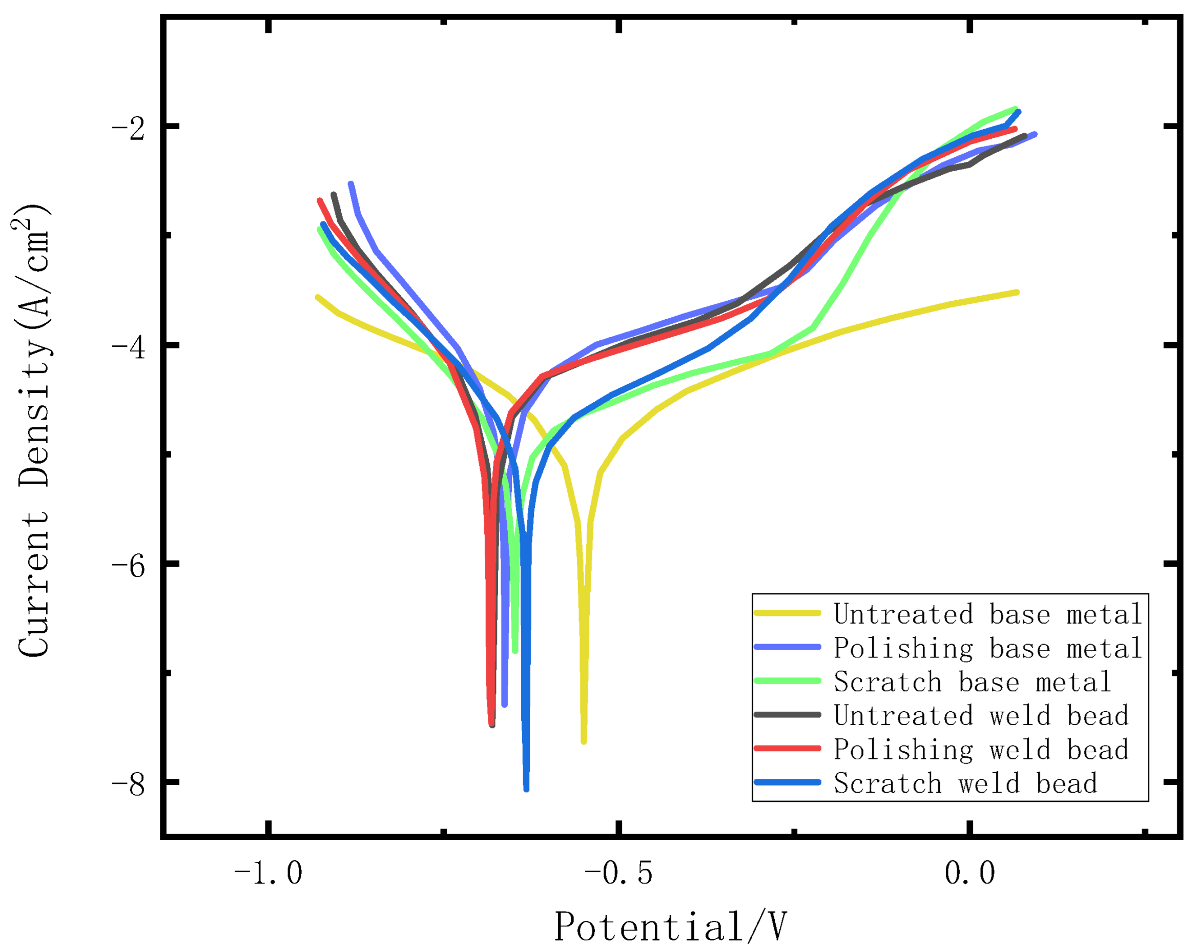 - The matrix sample after scratch treatment has a higher self-corrosion potential than other samples, and the corrosion products are also higher. Compared with the matrix, the self-corrosion potential of the welding part is higher, and the current density decreases, indicating that both the scratches left by the cleaning with the pipe ball and the welds generated by welding reduce the corrosion resistance of X65 steel.