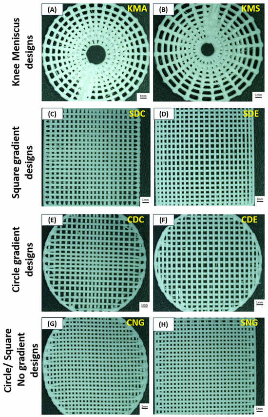 Optical images of the different PLA scaffold designs: (A) knee meniscus angled (KMA), (B) knee meniscus stacked (KMS), (C) square dense centre (SDC), (D) square dense edge (SDE), (E) circle dense centre (CDC), (F) circle dense edge (CDE), (G) circle no gradient (CNG) and (H) square no gradient (SNG). Scale bars represent 1 mm.