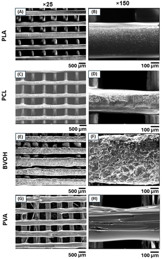 SEM micrographs of 3D-printed scaffolds acquired at two different magnifications. (A,B) PLA and (C,D) PCL exhibited superior print quality with smoother and more uniform surfaces compared to (E,F) BVOH and (G,H) PVA, which showed increased surface roughness and printing defects.