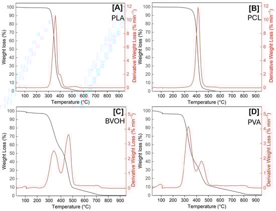 Comparison of thermogravimetric behaviour of PLA (A), PCL (B), BVOH (C), and PVA (D).