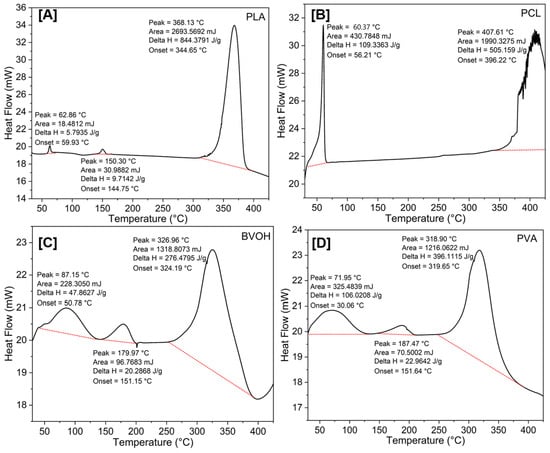 Comparison of DSC behaviour of PLA (A), PCL (B), BVOH (C), and PVA (D).