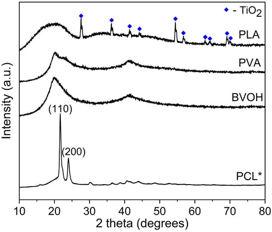 Comparison of PXRD behaviourPLA, PCL, BVOH, and PVA. * Due to the crystallinity of PCL, the intensity of this data was reduced by 5×.