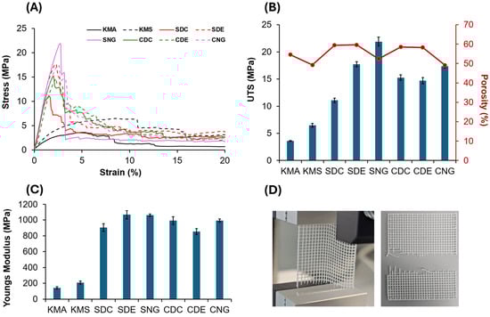 (A) Tensile test results for all scaffold designs: solid black line, knee meniscus angled (KMA); dashed black line, knee meniscus stacked (KMS); solid red line, square dense centre (SDC); dashed red line, square dense edge (SDE); solid pink line, square no gradient (SNG); solid green line, circle dense centre (CDC); dashed green line, circle dense edge (CDE); and dashed pink line, circle no gradient (CNG). (B) Influence of the various designs on ultimate tensile strength (UTS) and porosity. (C) Young’s modulus. (D) Images illustrating scaffold clamping during tensile testing: the left image shows an improperly clamped scaffold during testing, exhibiting slippage or misalignment, while the right image shows a properly clamped scaffold after testing, demonstrating correct alignment and secure fixation within the test rig for reliable measurements.