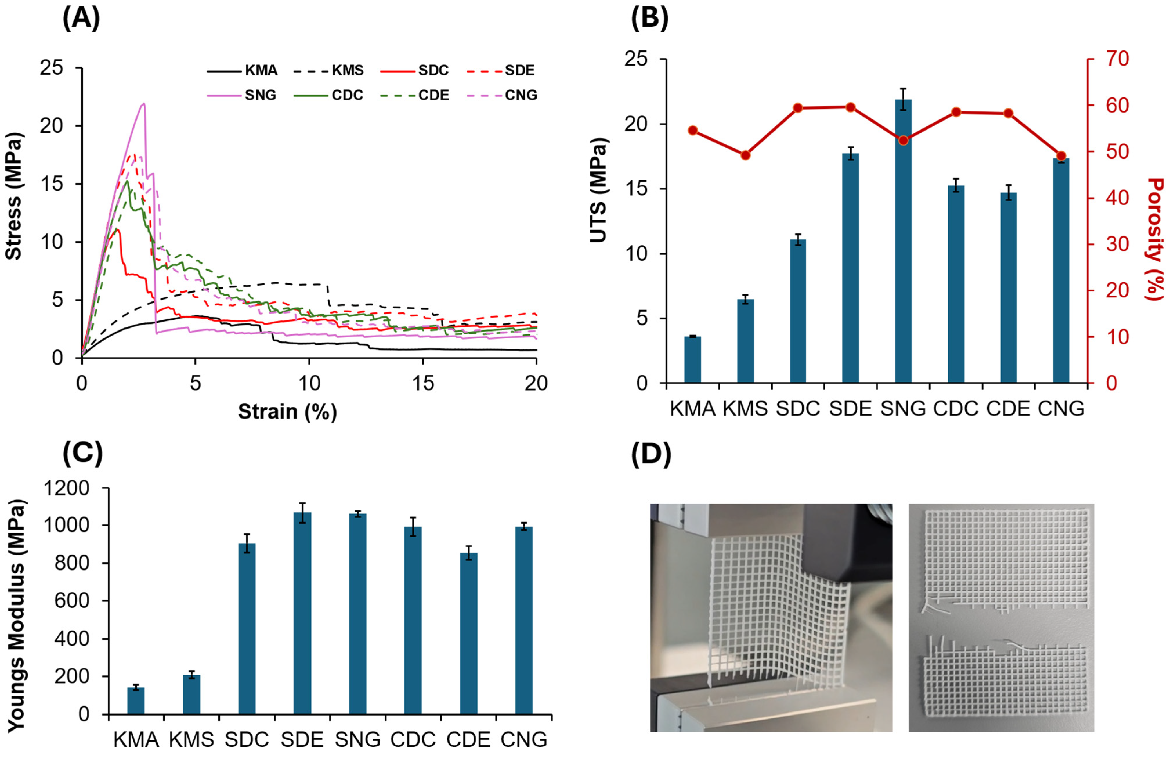 - Poonawala, K.; Zhang, B. Influence of 3D printing process parameters and design on mechanical properties of tissue scaffolds. MATEC Web Conf. 2025, 413, 08003. [Google Scholar] [CrossRef]