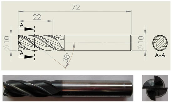 Each specimen was prepared in the form of rectangular samples with dimensions 50 × 30 × 7 mm to ensure uniformity of the testing conditions. The cutting tool employed in the experiments was a solid carbide end mill EC-E4L 10-22/32W10CF72 with a TiAlN coating of 3 µm, supplied by ISCAR, Tefen, Israel [25], diameter 10 mm, with the following characteristics (Figure 1):