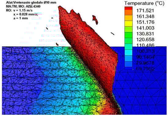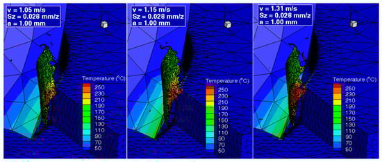 Figure 8 shows the displays of simulations that were recorded at the same time intervals, with the same zone selected for comparison. The chosen zone is the zone in which the tooth exits from the contact with the workpiece. It can be noticed that the tooth top is in simulation with the biggest cutting speed in the red zone, which means that in this case the temperature is the highest (Figure 8).
