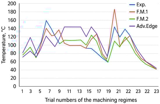 The analysis was performed in the form of a diagram (Figure 9), where the abscissa in the coordinate system represents the corresponding trial numbers of the machining regimes from Table 4, while the ordinate shows the temperature values in the cutting zone.