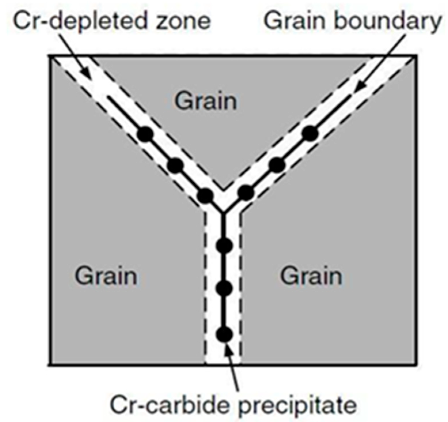 - Kumar, V.; Arora, H.; Pandey, P.; Ratore, V. Analysis of sensitization of austenitic stainless steel by different welding processes: A review. Int. J. Appl. Eng. Res. 2015, 10, 17837–17848. Available online: https://www.ripublication.com/ijaer10/ijaerv10n7_140.pdf (accessed on 27 January 2025).