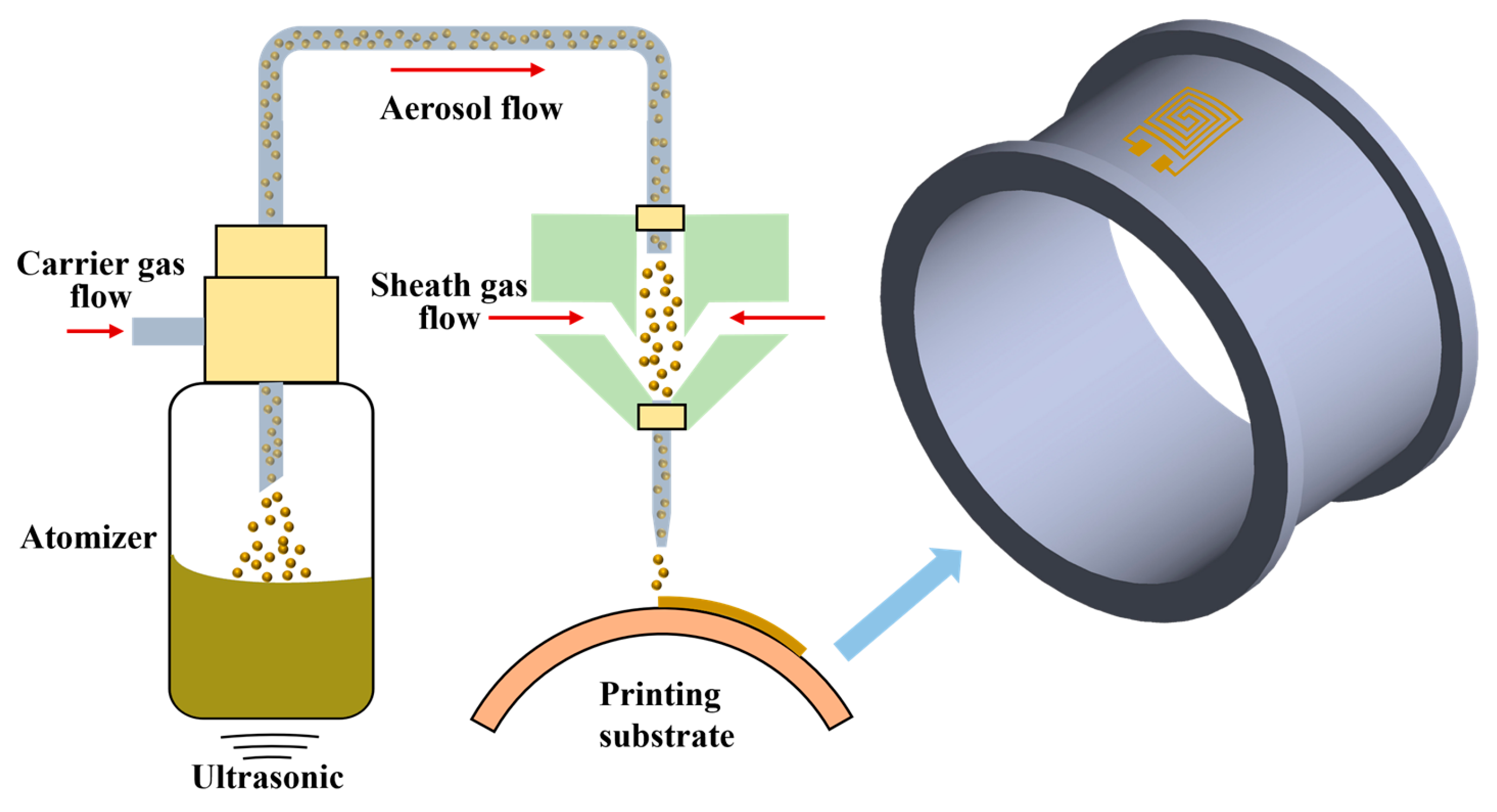 - Bappy, M.O.; Jiang, Q.; Atampugre, S.; Zhang, Y. Aerosol Jet Printing of High-Temperature Bimodal Sensors for Simultaneous Strain and Temperature Sensing Using Gold and Indium Tin Oxide Nanoparticle Inks. ACS Appl. Nano Mater. 2024, 7, 9453–9459. [Google Scholar] [CrossRef]
