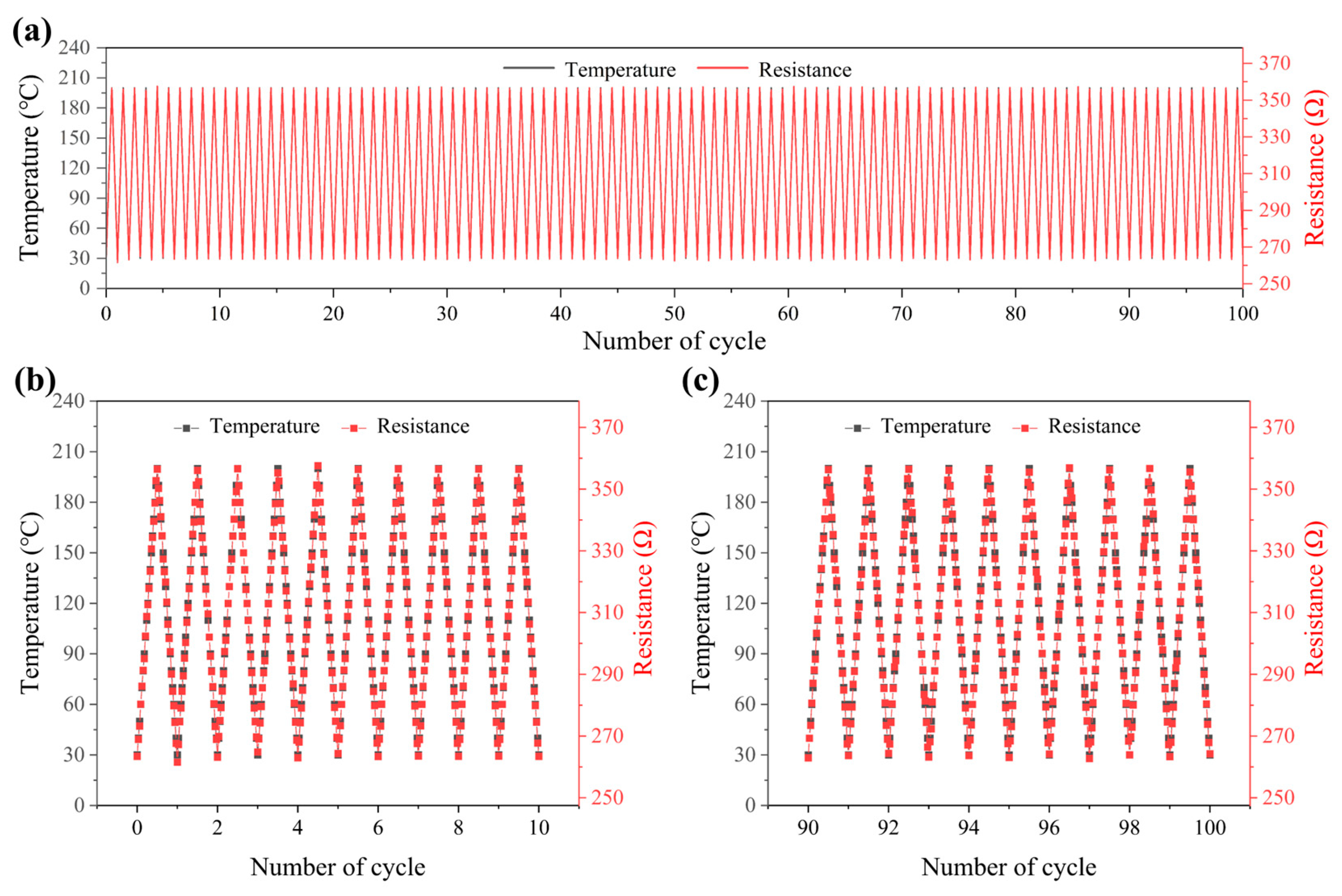 | This work | Commercial Ag NPs Ink | Yes | Low | 2.15 × 10−3/°C | Resistance fluctuation < 0.5% over 100 cycles |