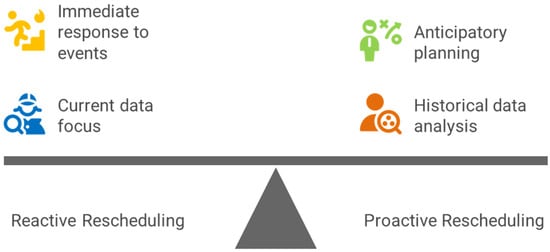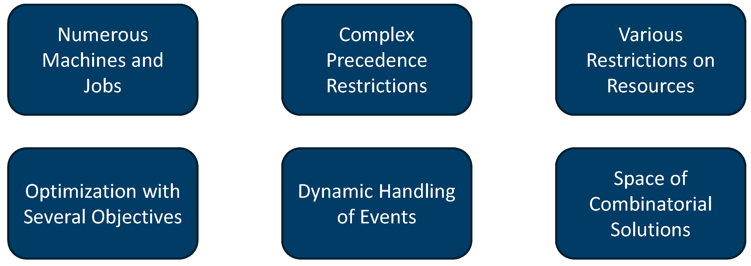 - Holguin Jimenez, S.; Trabelsi, W.; Sauvey, C. Multi-Objective Production Rescheduling: A Systematic Literature Review. Mathematics 2024, 12, 3176. [Google Scholar] [CrossRef]