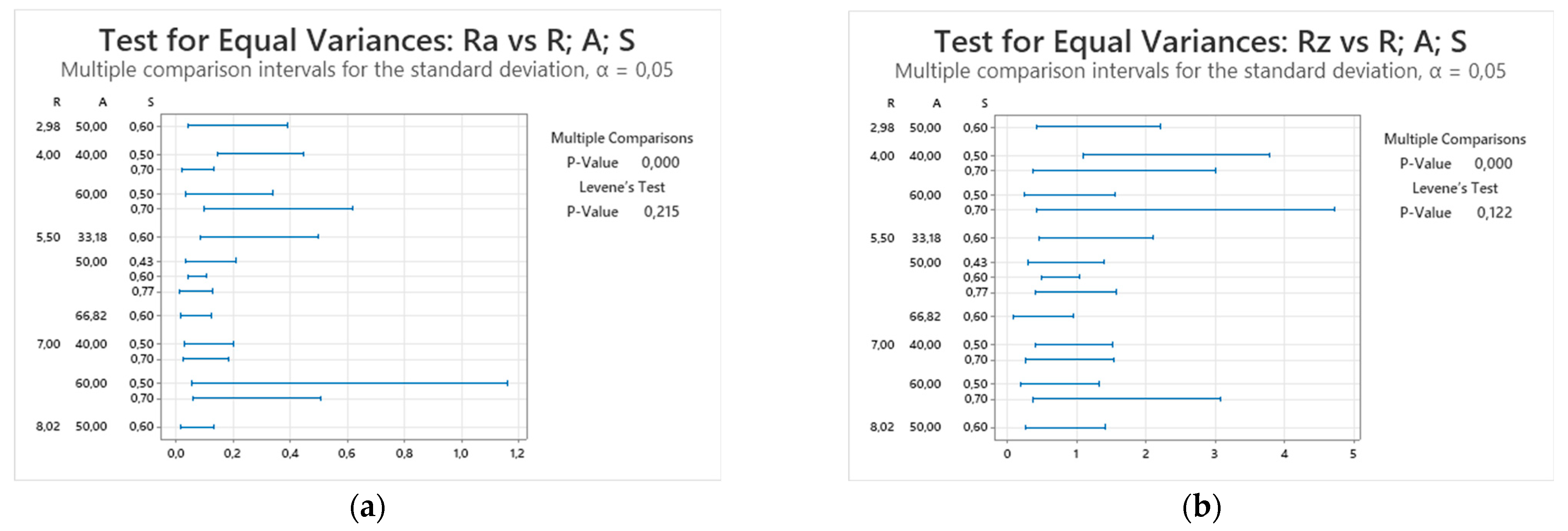 p > 0.05. Findings from both response tests should be considered during model diagnostics. The multiple comparison procedure flagged significant differences in variance between certain data pairs. This does not contradict the global Levene’s test result but indicates that a few factor combinations may exhibit higher variability, a phenomenon commonly observed in machining experiments due to their dynamic nature. Furthermore, some data points exhibit relatively large standard deviation intervals, which could be attributed to process instability, improper tool engagement, or tool deflection caused by certain factor combinations.