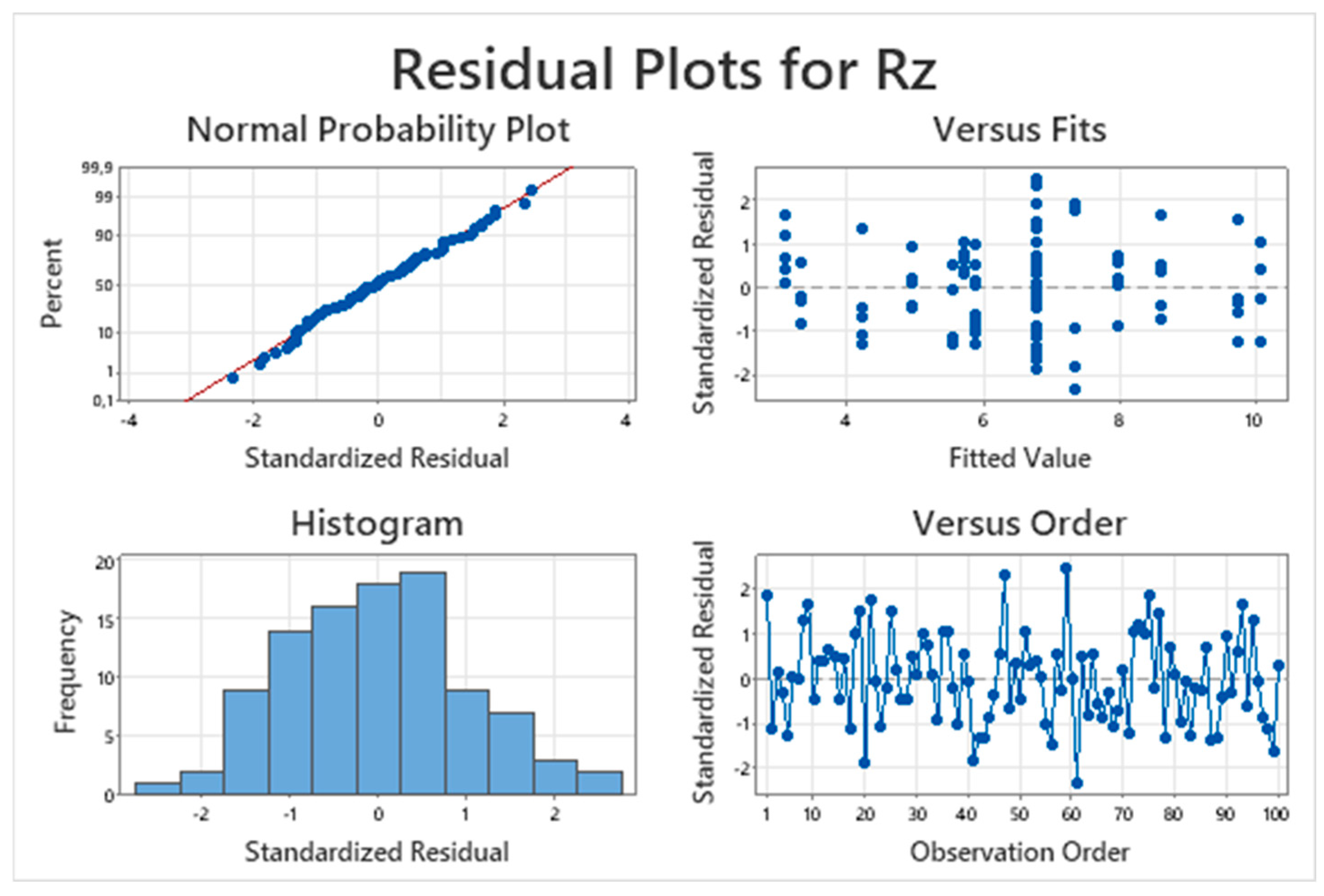 Figure 9 confirms that the adopted quadratic model satisfies the fundamental assumptions of normality, independence, and constant variance. Similar behavior of residuals has been reported in other machining studies employing quadratic response surface models, where increased model complexity did not lead to violations of statistical assumptions [