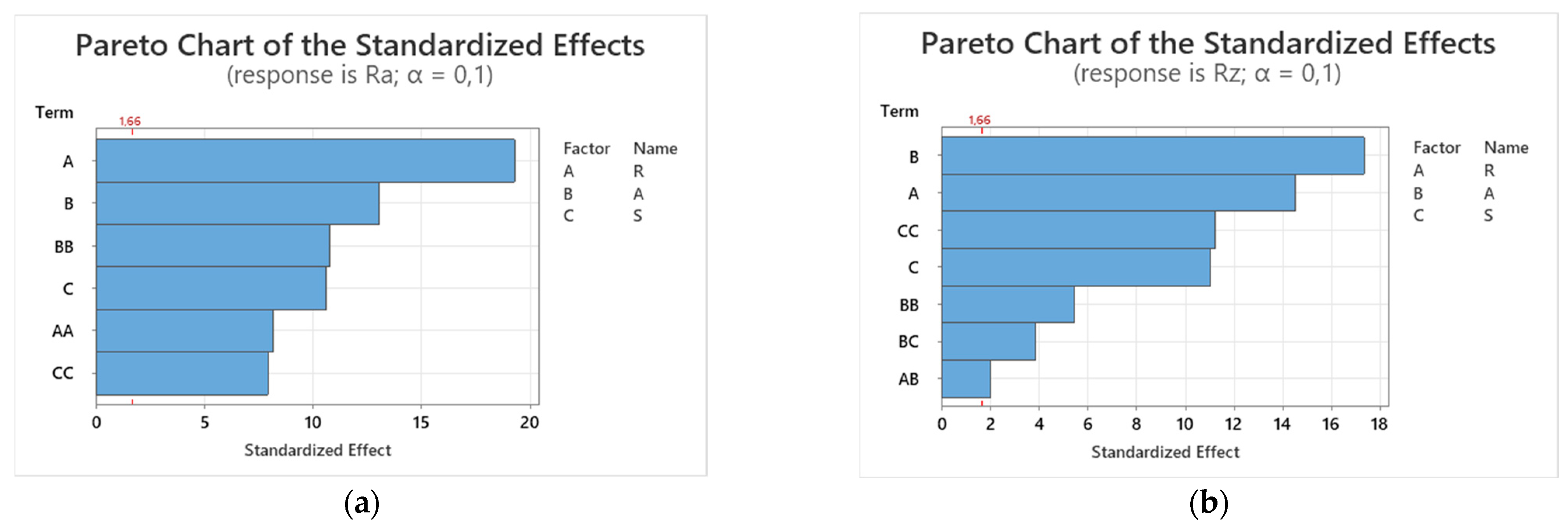 Figure 10a. The dominant factor is radius, which aligns with literature findings, followed by inclination angle and stepover height. The strong effect of radius can be attributed to cusp height reduction when using larger radii at the same stepover height. Inclination angle shows a more pronounced effect than stepover height, suggesting that the dynamic component of the machining process plays a substantial role in determining R