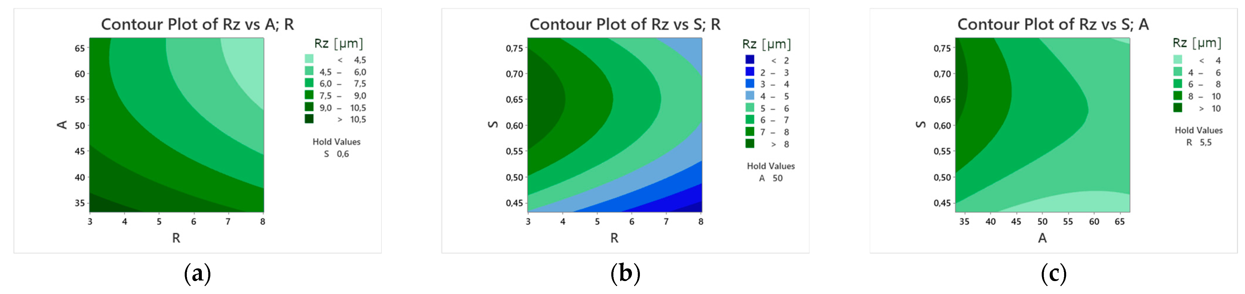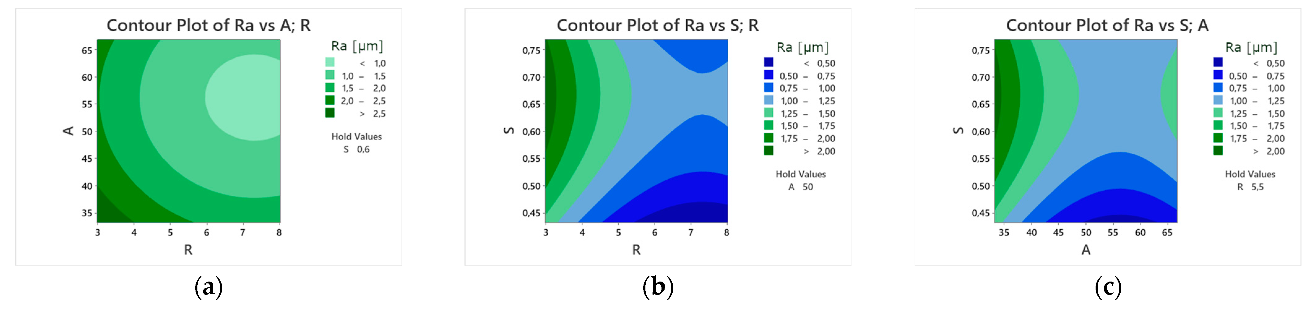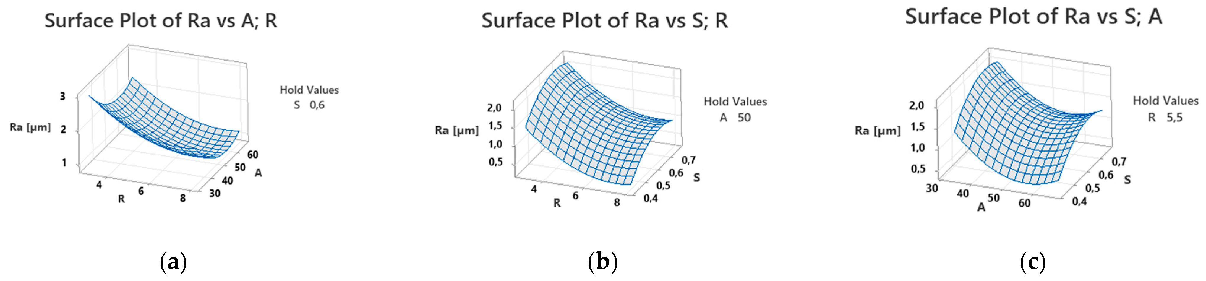 A second-order response surface model was developed for Ra using backward elimination at a 10% significance level to remove statistically insignificant terms. The final model retained all three factors, R, A, and S, and their quadratic terms, while all two-way interactions were excluded. Variance inflation factors, VIF < 1.5, for all terms confirmed the absence of multicollinearity among predictors.