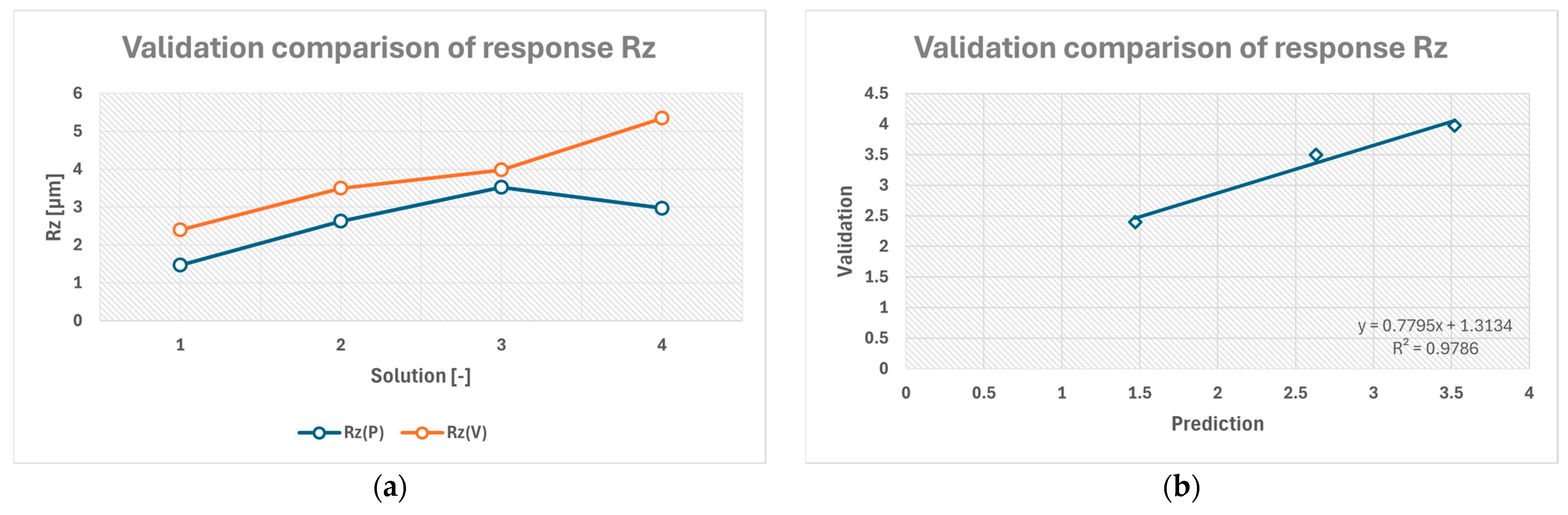 Figure 16a, the overall trend of predicted and measured values is consistent for the first three solutions, with Solution 4 showing a significant deviation. This discrepancy is attributed to the extreme value of the stepover height factor, which was outside typical finishing operation conditions and likely introduced higher variability.