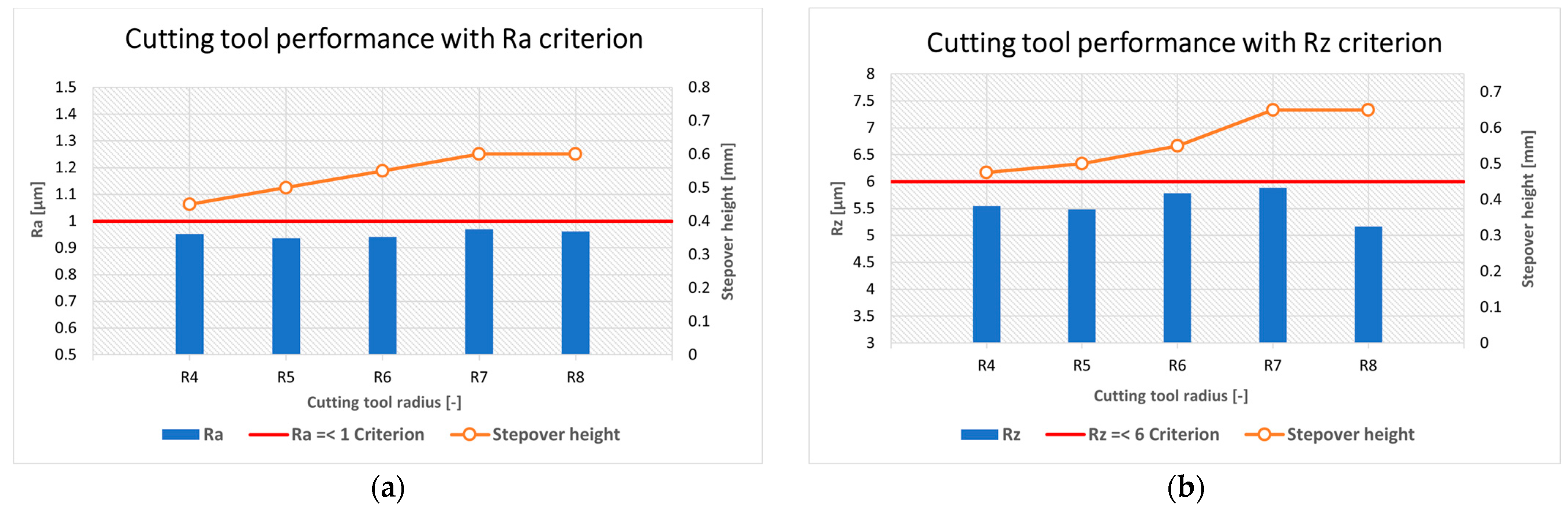 a criterion. The primary difference lies in the allowable stepover height. From R4 to R7, the Stepover height increases in approximately 0.05 mm increments, whereas no further increase is observed between R7 and R8, indicating a saturation effect. The total increase in allowable stepover height between R4 and R7 is 0.2 mm, corresponding to a 33.33% increase. Although the absolute magnitude of this improvement appears modest, such an increase in Stepover height can significantly enhance process efficiency in finishing operations. Larger allowable Stepover heights directly reduce toolpath density and machining time, thereby improving overall productivity and economic output in production environments. Direct economic comparison of tooling costs or cost per part is currently not feasible, as the investigated cutting tools were specifically designed for the purposes of this study and are considered special cutting tools at the present stage of development. A detailed cost-per-part analysis will be addressed in future work once the proposed cutting tool concept reaches a level of manufacturing maturity suitable for industrial deployment.