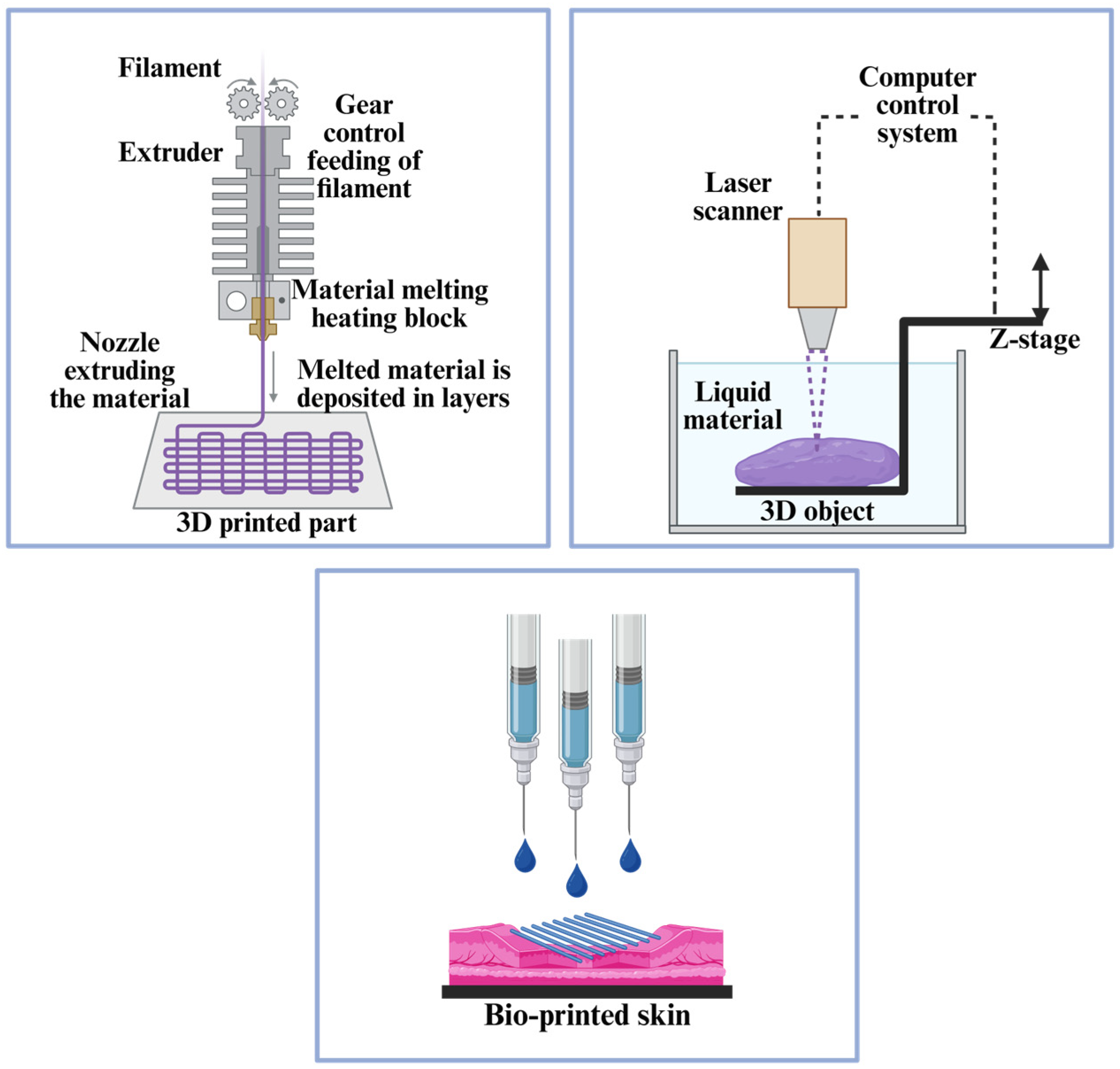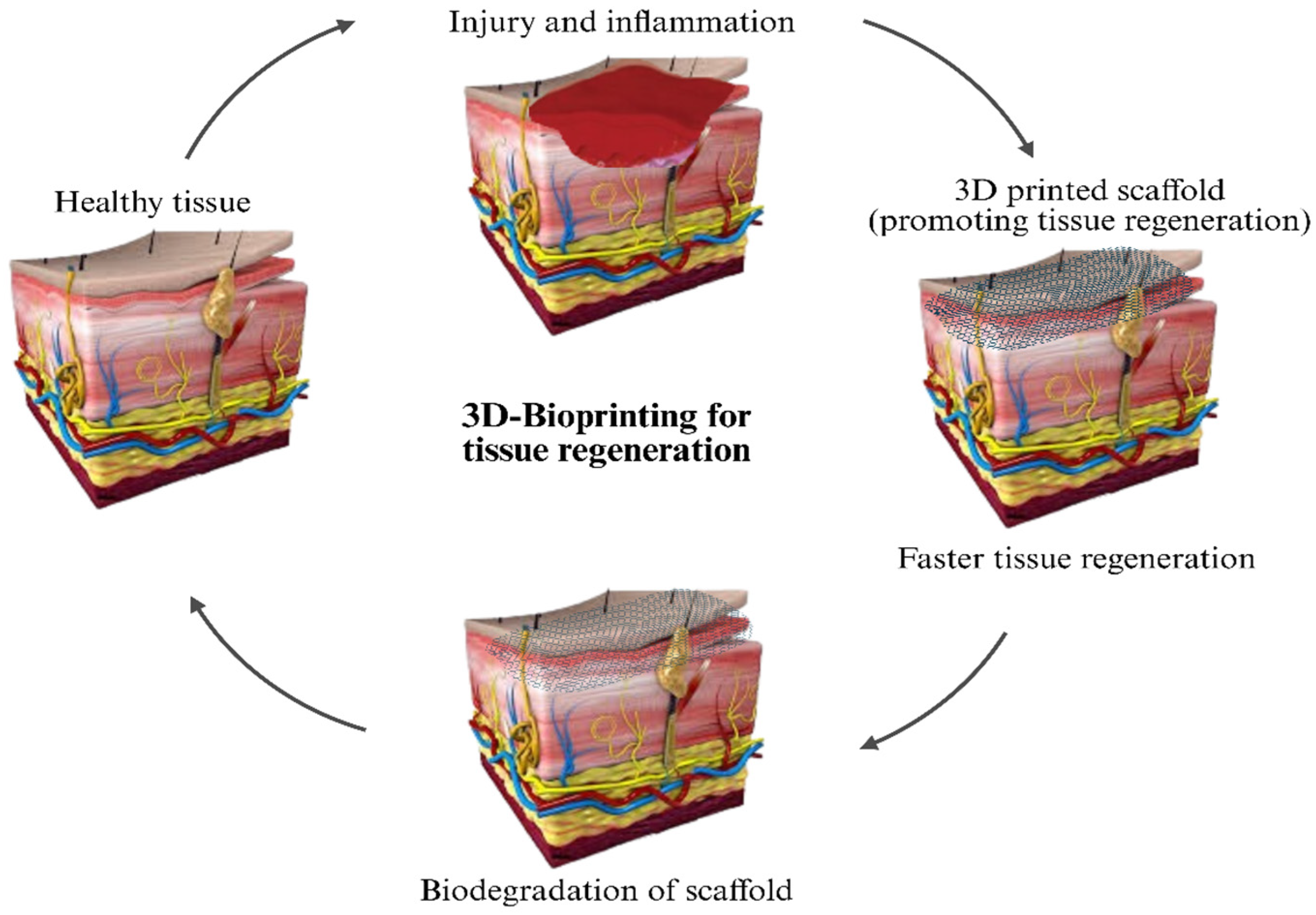 - Gupta, S.; Kumar, G.; Dubey, S.; Sharma, G.; Singh, S.; Minz, S. 3D Bioprinting for Skin and Tissue Engineering. In 3D Printing and Microfluidics in Dermatology; CRC Press: Boca Raton, FL, USA, 2025; pp. 125–156. [Google Scholar]