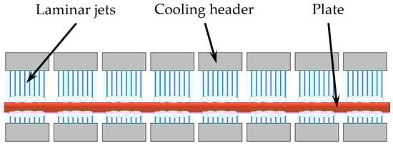 The plate cooling process is carried out in an accelerated cooling unit (ACU), which consists of 72 headers arranged above and below (36 each, respectively). The unit is schematically shown in Figure 2. A header is a plate with over 1000 holes drilled in it.