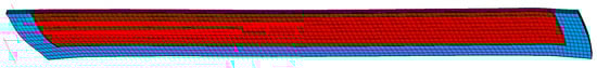 The initial state of the modeled body (plate clad rolled product) was obtained based on other work by the authors [15], where the process of rolling clad plates was modeled. The plate is positioned on a plane simulating the roller table. The base layer was divided into 11,300 eight-node elements, and the cladding layer into 2800. The material model is elastic–plastic. Longitudinal symmetry was used; the general view of the model from the cladding layer side is shown in Figure 3.
