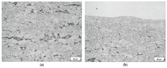 The base X70 steel exhibits a microstructure of polygonal ferrite (70%, ASTM 10-13, ~8–14 µm), bainite (20%), and pearlite (10%) (Figure 16a). This combination together with fine grain provides the requisite high strength and toughness. Adjacent to the interface with the overlaid layer, a shallow decarburization zone ≤ 40 µm wide is observed, consisting of carbon-depleted ferrite (Figure 16b). While locally altering properties, this zone does not compromise the bulk material performance.