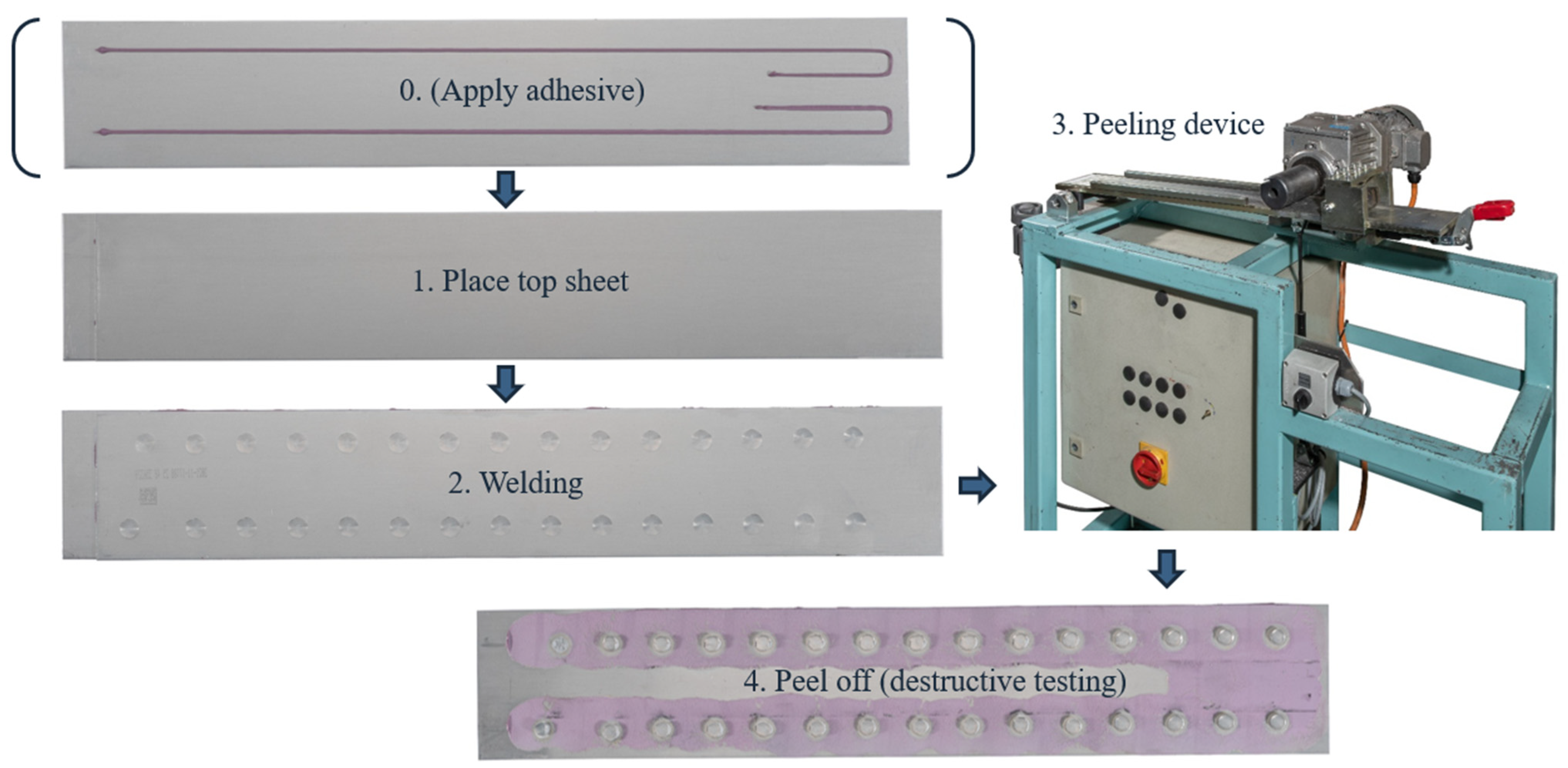 - DIN EN ISO 10447; Widerstandsschweißen—Prüfung von Schweißverbindungen—Schäl- und Meißelprüfung von Widerstandspunkt- und Buckelschweißverbindungen [Resistance Welding—Testing of Welds—Peel and Chisel Testing of Resistance Spot and Projection Welds]. DIN—Deutsches Institut für Normung e.V.; Beuth Verlag GmbH: Berlin, Germany, 2015.