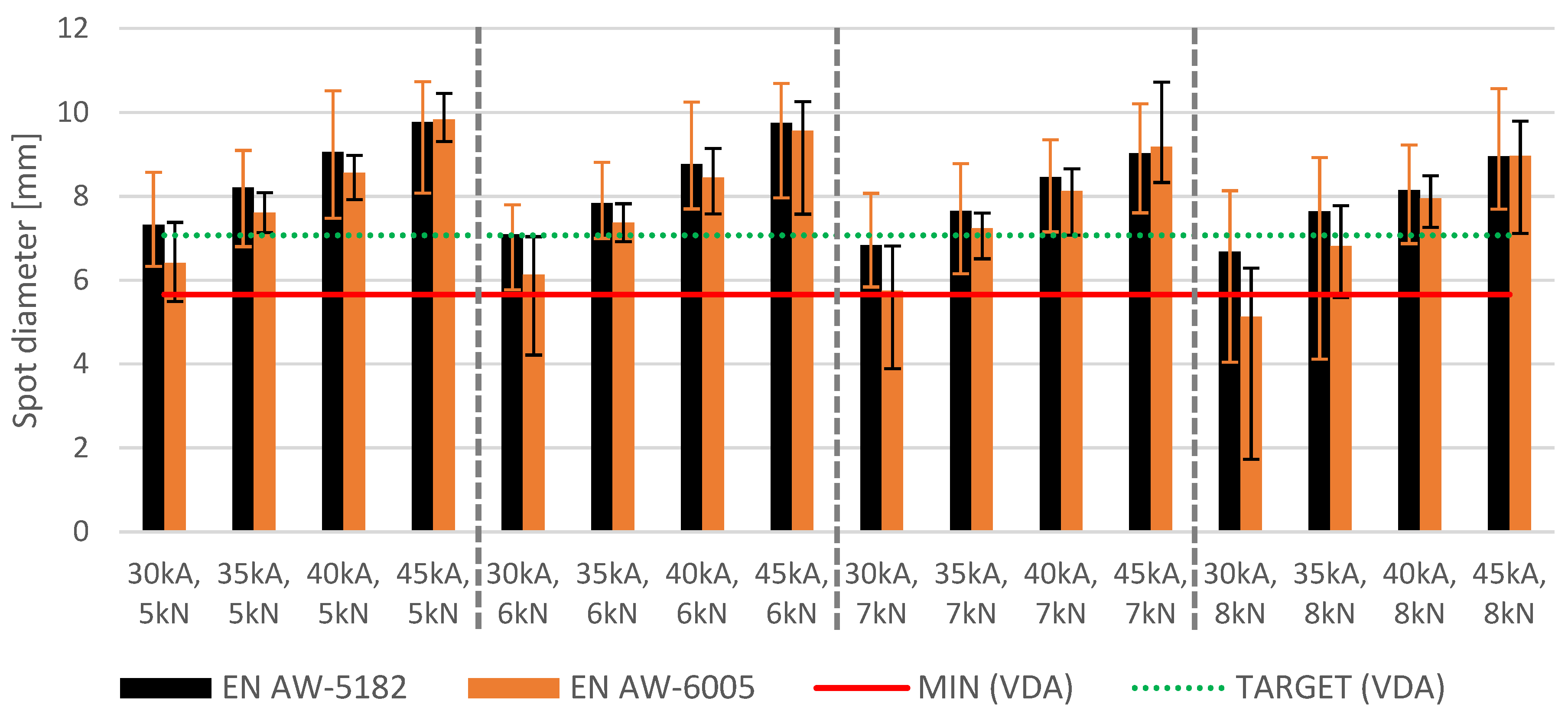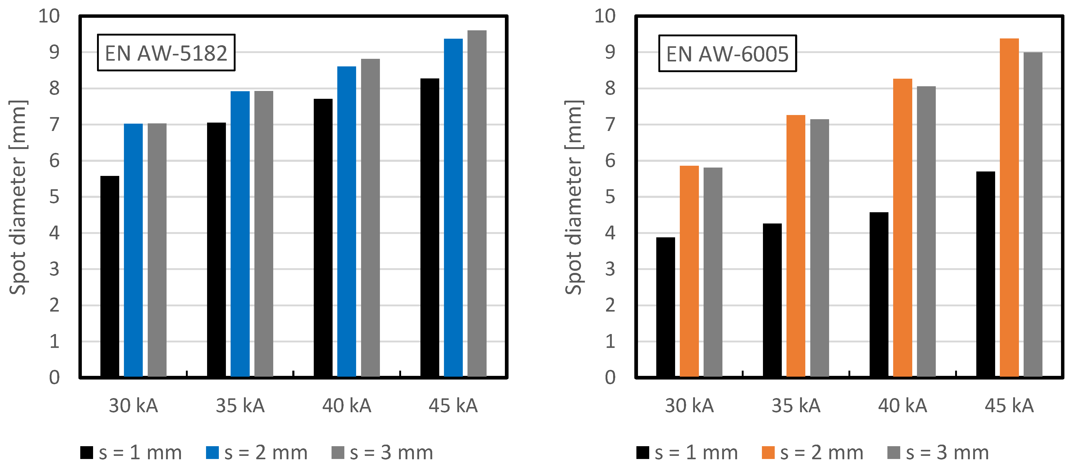- A change in current affects EN AW-6005 more than EN AW-5182. It should be noted that EN AW-5182 had a spatter rate of 97%, while EN AW-6005 exhibited no spatter, which also affects the spot diameter.