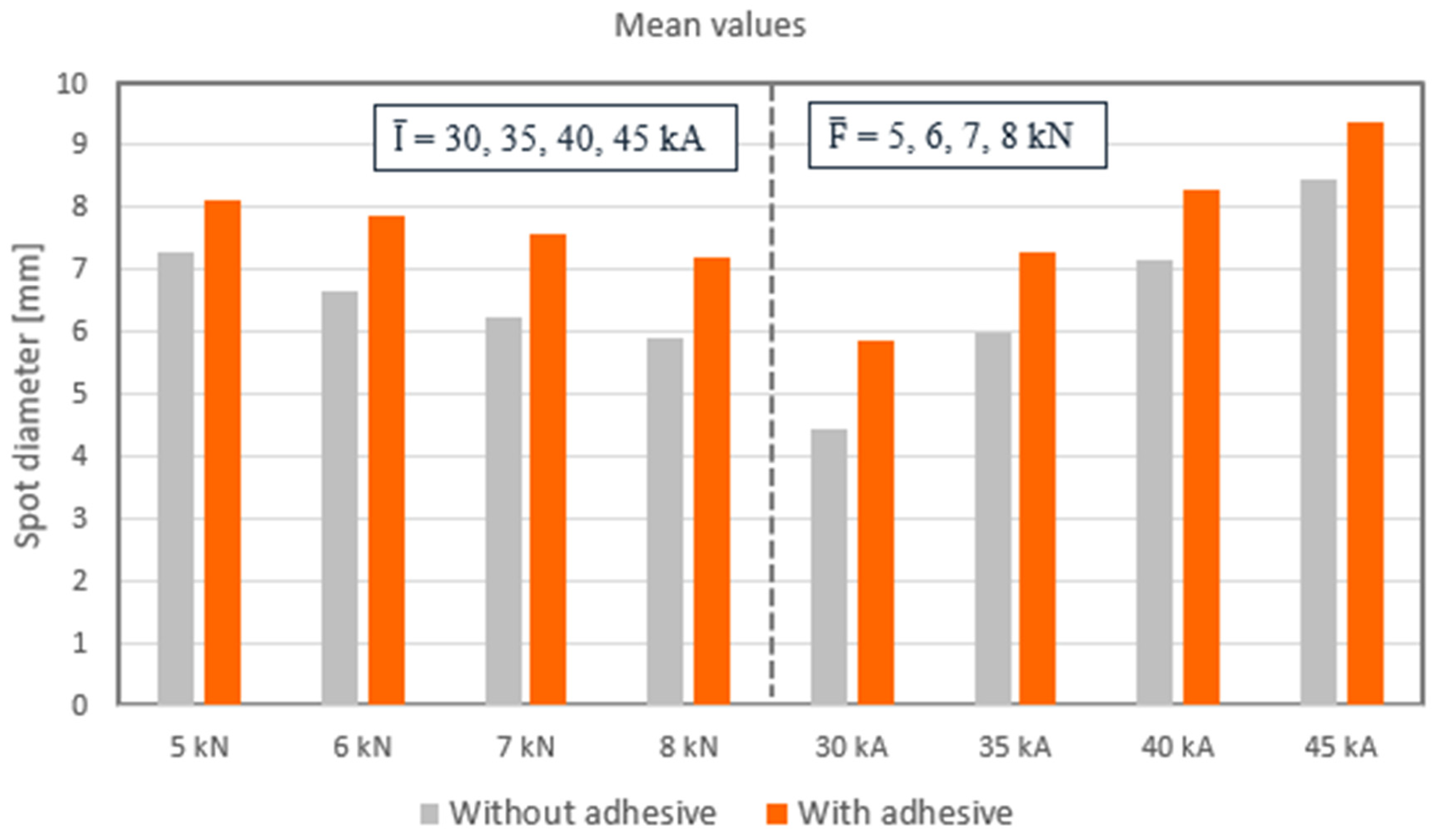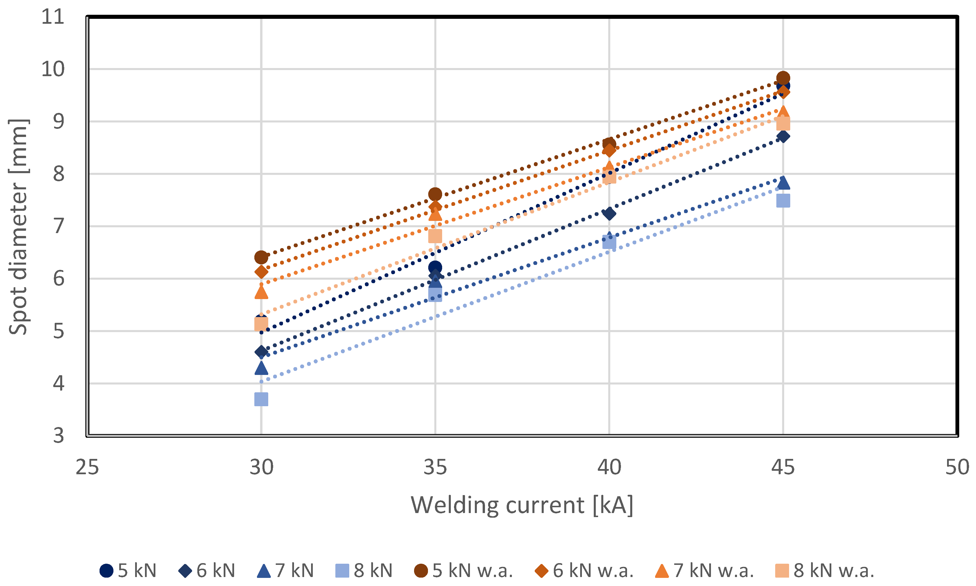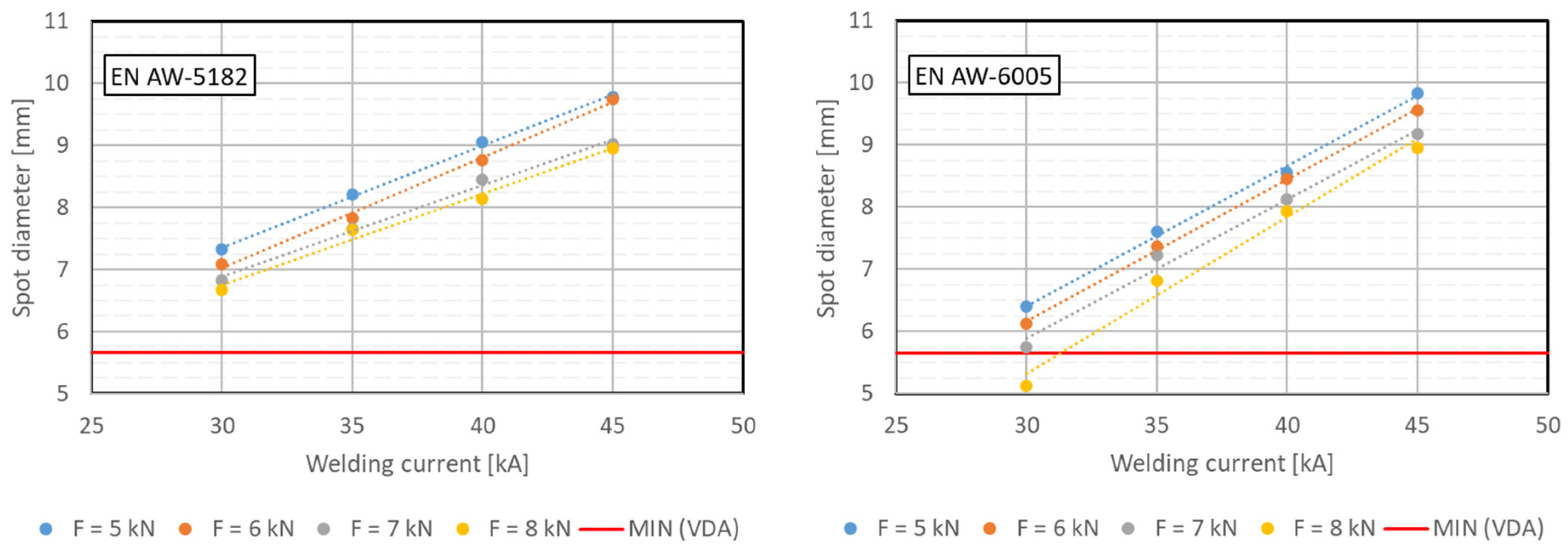 - Spot diameter increases with increasing welding current and decreases with increasing electrode force. The range significantly below the minimum spot diameter specified in the VDA recommendation 238-401 [36] was not considered in this study.