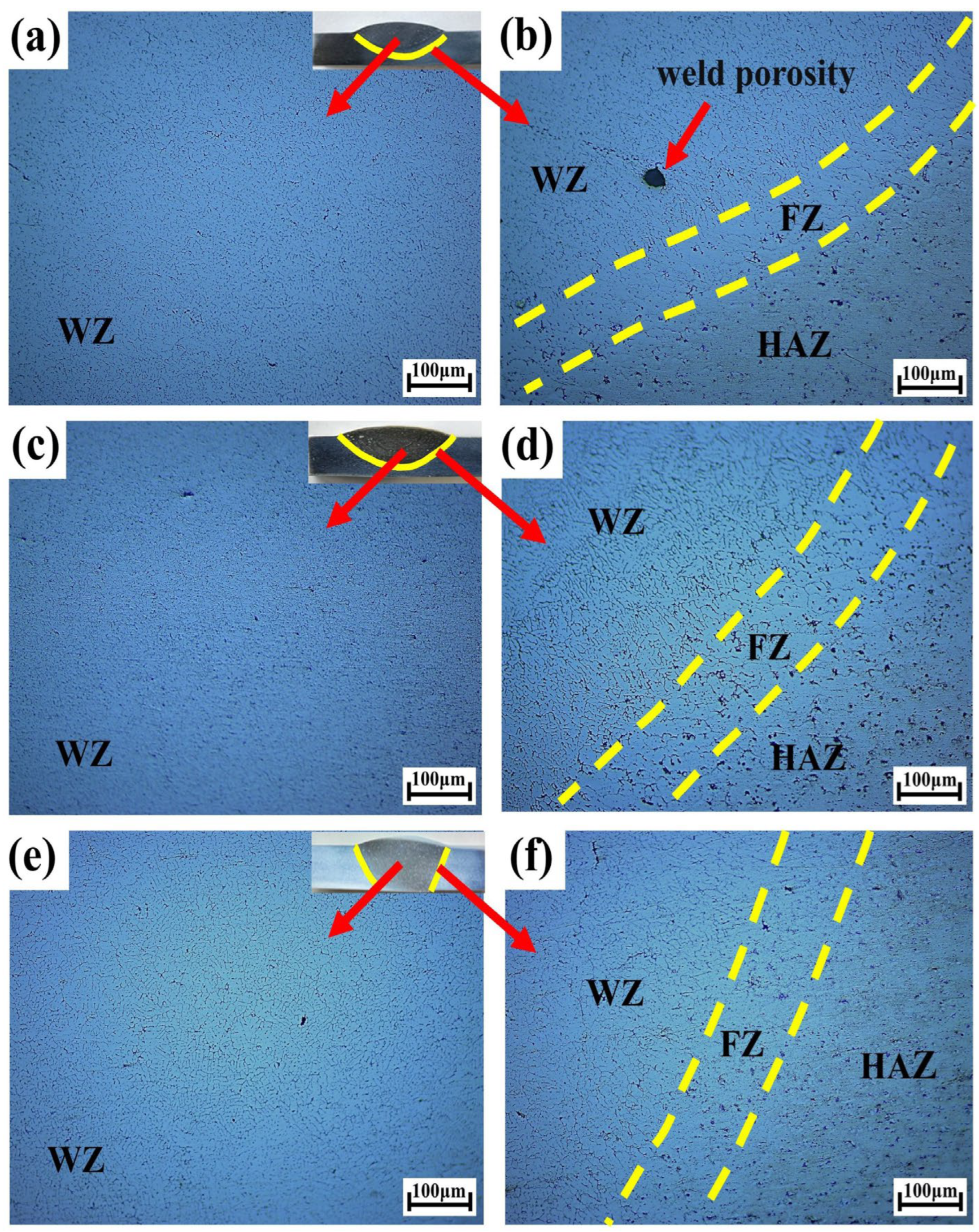 - Yan, S.; Chen, H.; Zhu, Z.; Gou, G. Hybrid Laser-Metal Inert Gas Welding of Al–Mg–Si Alloy Joints: Microstructure and Mechanical Properties. Mater. Des. 2014, 61, 160–167. [Google Scholar] [CrossRef]