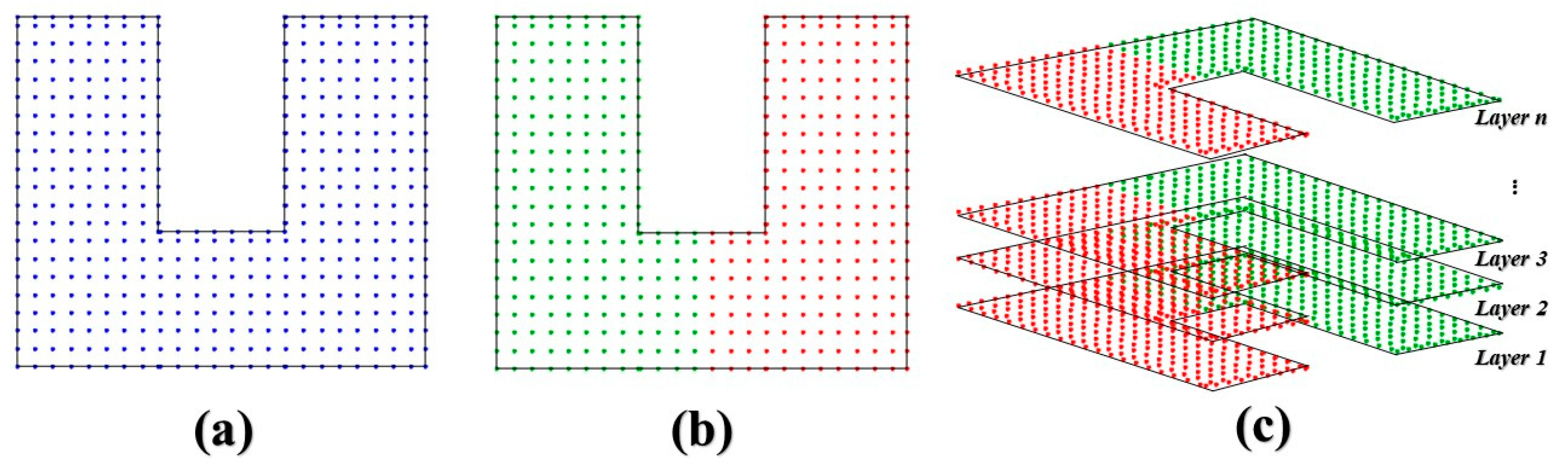12] discussed that this approach has been used to improve various tasks, such as analyzing mechanical properties influenced by toolpath patterns, geometry, and layering effects; real-time control guided by precise extraction and clustering of molten pool geometric features; and defect prediction using melt images, among others. However, applying clustering to path planning in GMA-DED remains unexplored, indicating significant potential for integration into a pixel-based strategy, which breaks down a 3D model’s layers into a grid of connected points, similar to pixels on a screen. Then it uses optimization algorithms to find a smooth and efficient tool path that visits all these “pixel” nodes, ensuring the entire layer is filled. Therefore, processing time is a drawback of this Pixel approach when complex shapes are planned. However, beyond assessing its potential to reduce computational time, it is also crucial to evaluate whether this method can ensure the quality of the generated trajectory and, consequently, the quality of the deposited part. Comprehensive comparisons between the Pixel family of path-planning strategies and traditional approaches such as raster, contour-parallel, and graph-based planners have been reported in previous publications [