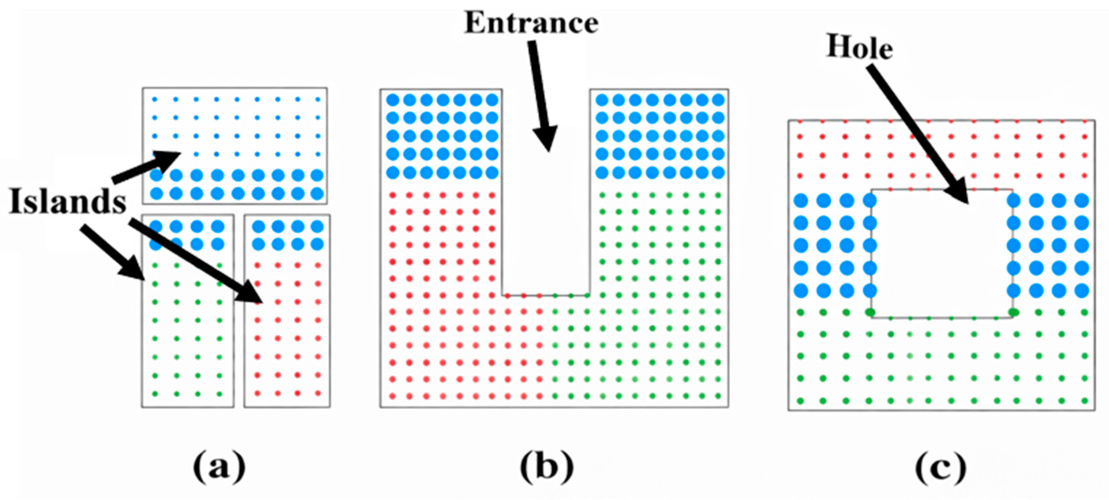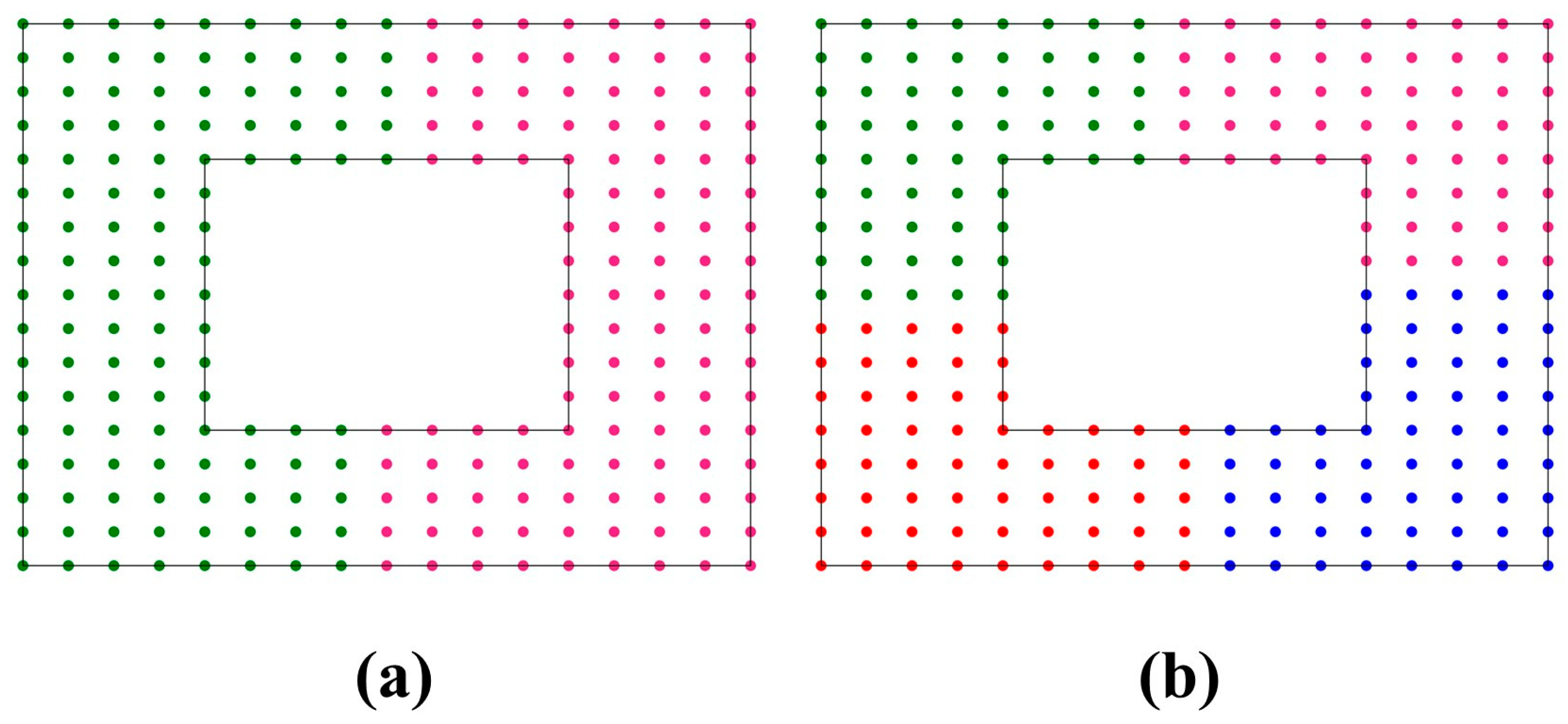 Figure 6a schematizes two clusters (represented in red and green) generated for a square-shaped layer.
