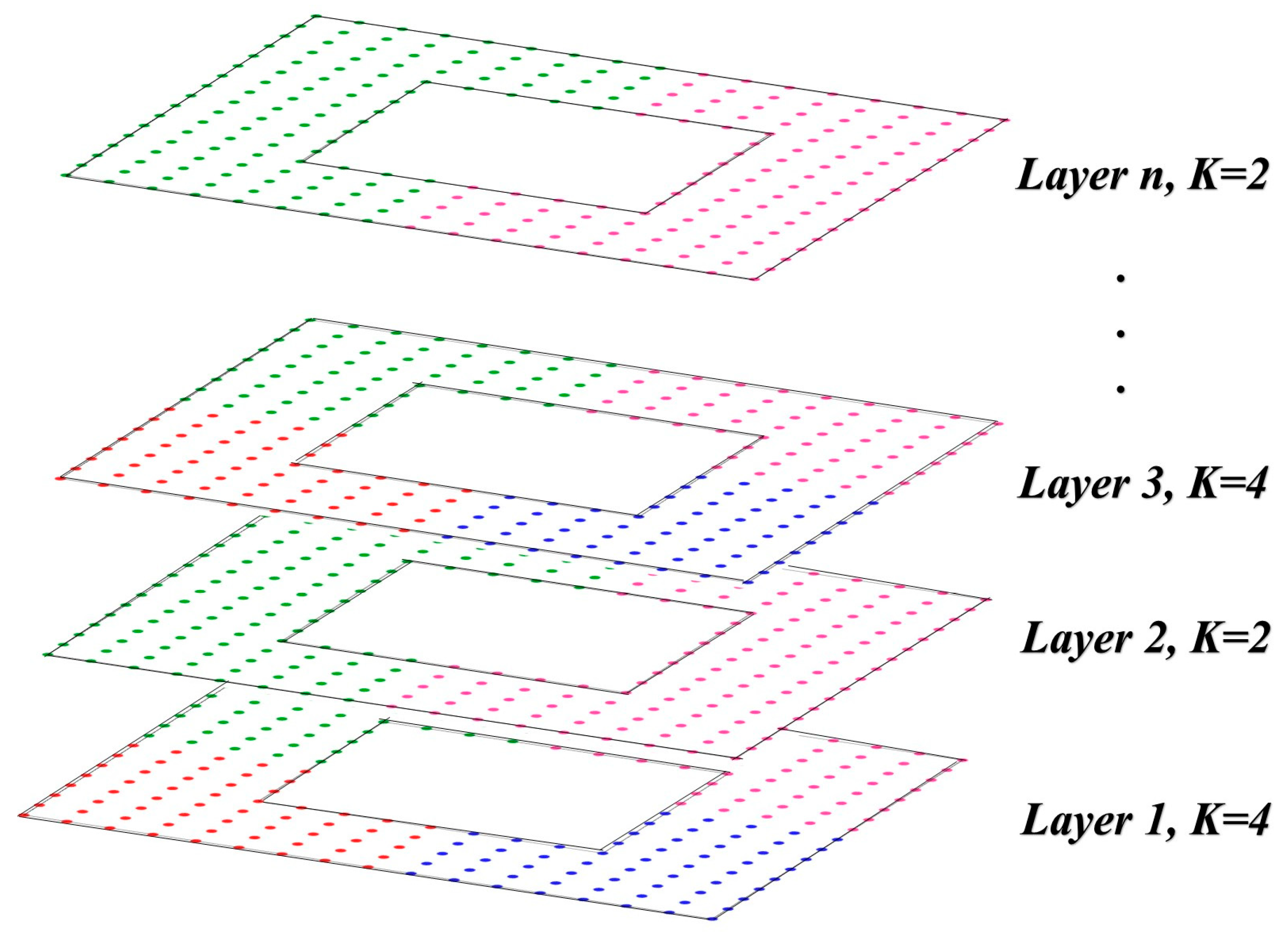 K = 2) in a layer. This clustering configuration is applied across all layers, regardless of whether their geometries are identical, as depicted in
