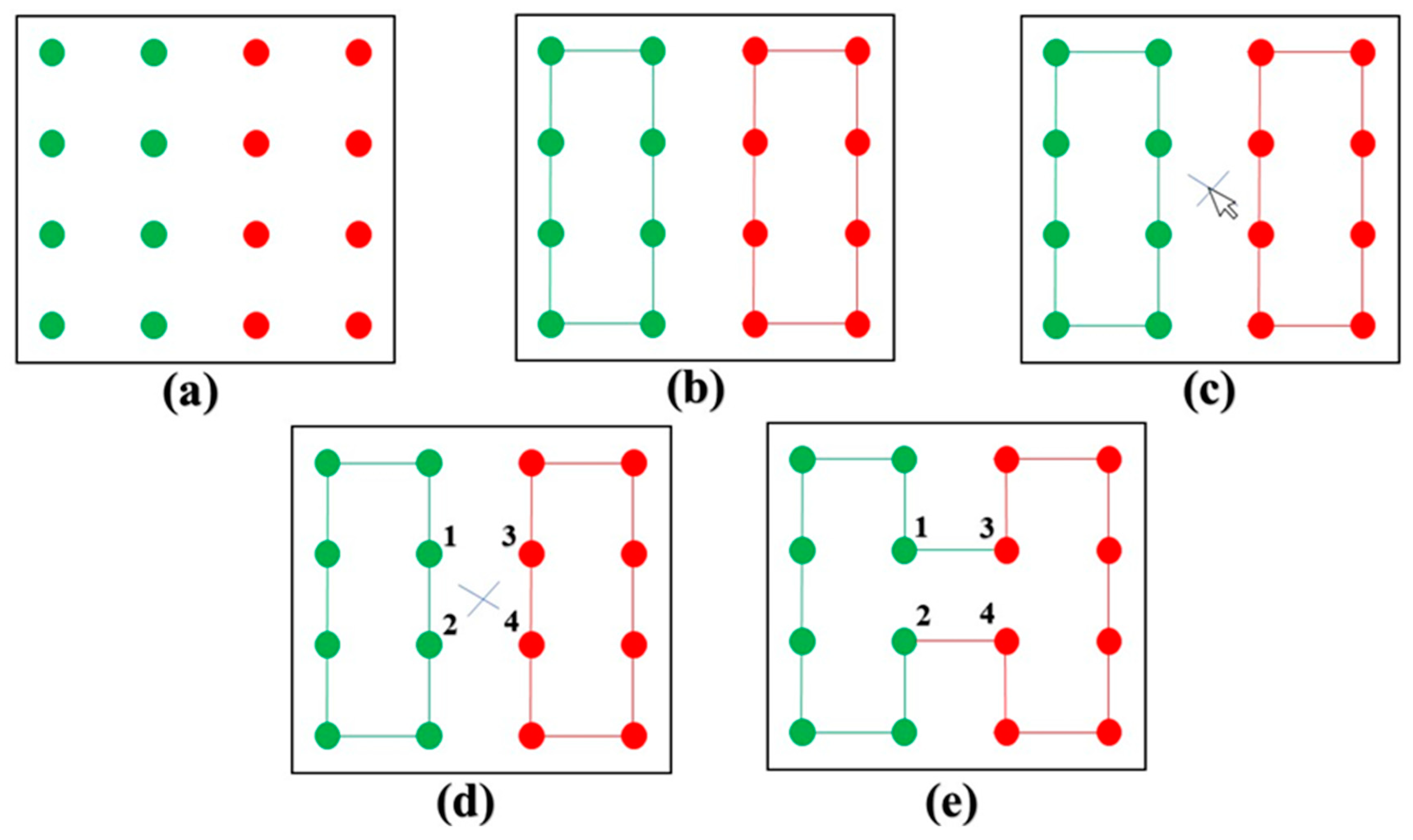 Figure 6c by a blue “x” and an arrow. This command consists of selecting a reference point in the space between two consecutive clusters. Based on this reference point, the Fast Advanced-Pixel algorithm identifies the closest pair of nodes—one from each cluster. For example,