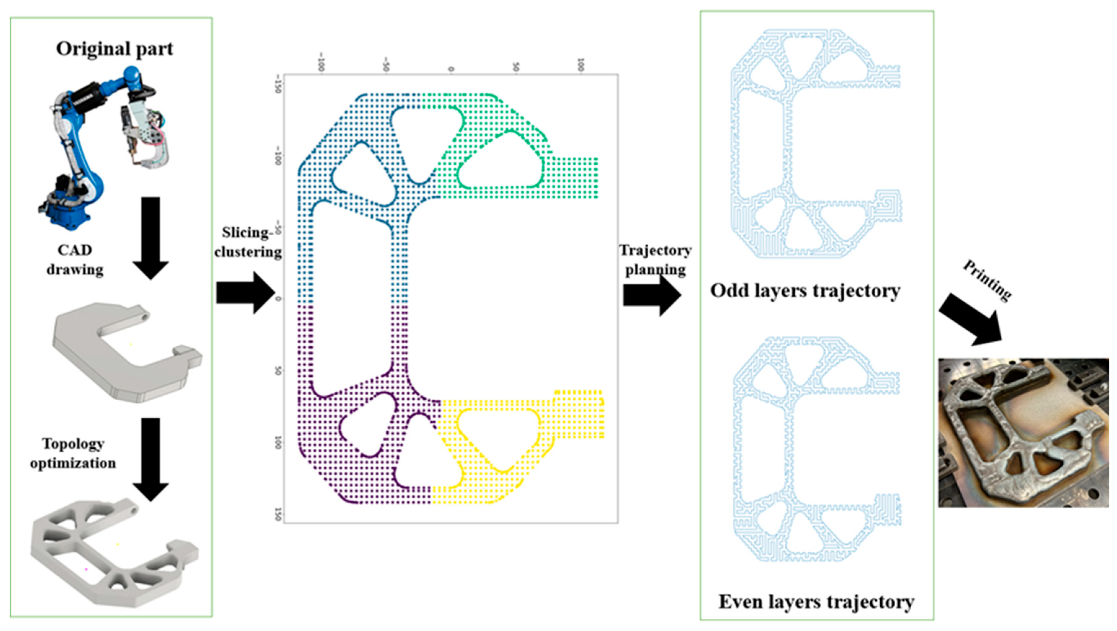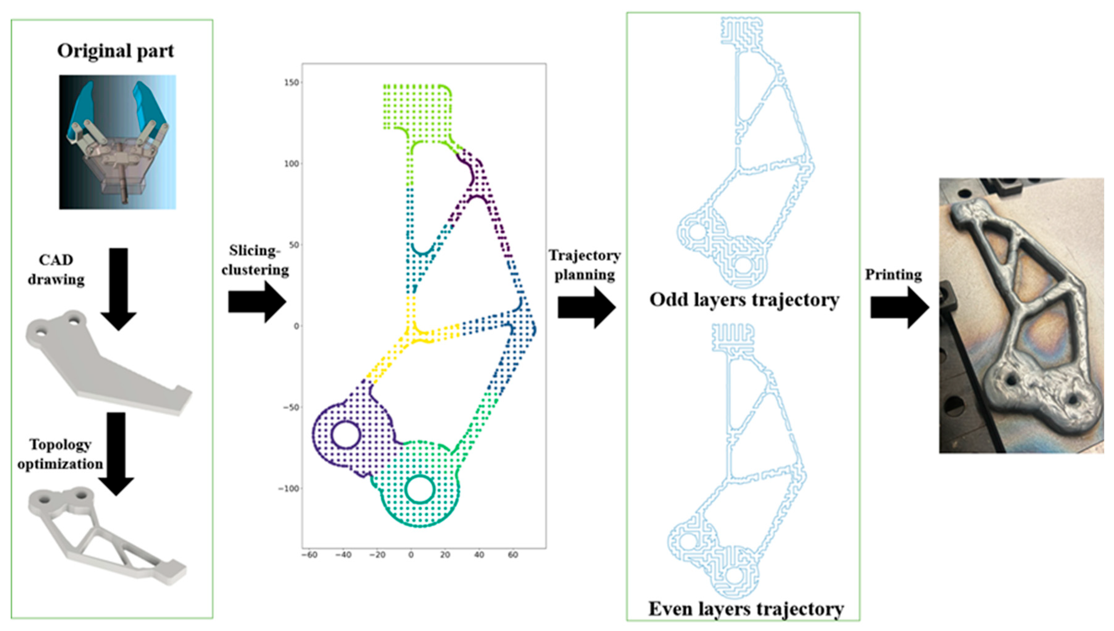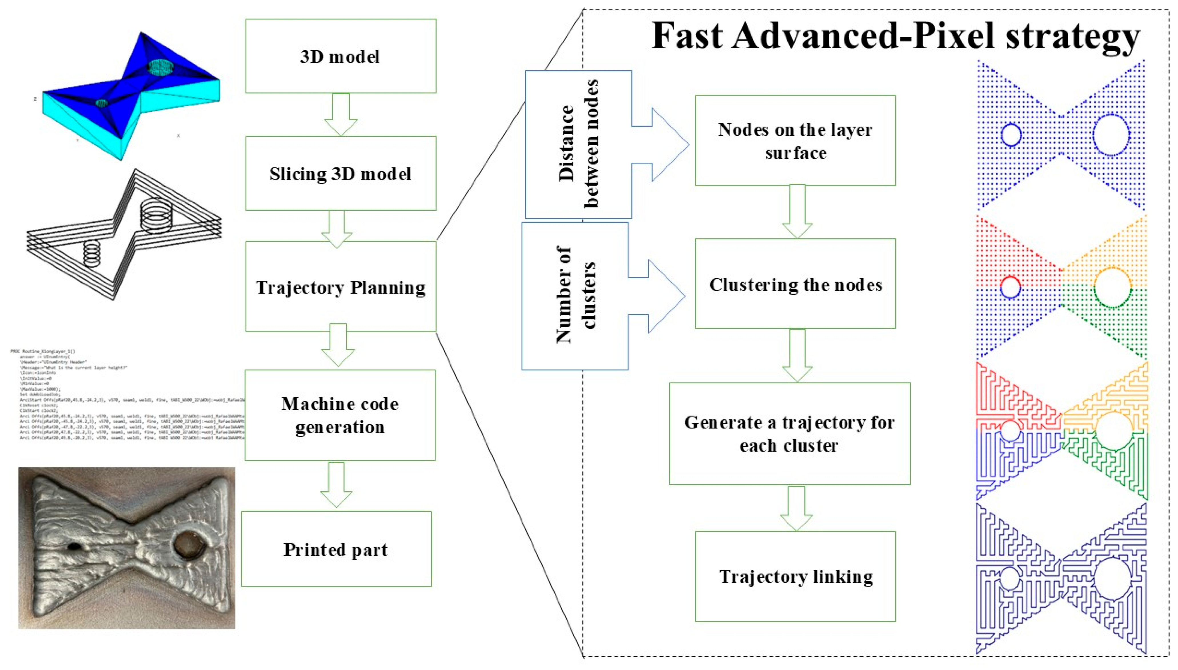 Figure 7 illustrates the 3D printing workflow, starting from the 3D model. The model is then sliced and prepared for trajectory planning through the Fast Advanced-Pixel strategy. In this strategy, the user inputs the distance between nodes (as shown in the step “Nodes on the layer surface”) and the number of clusters,
