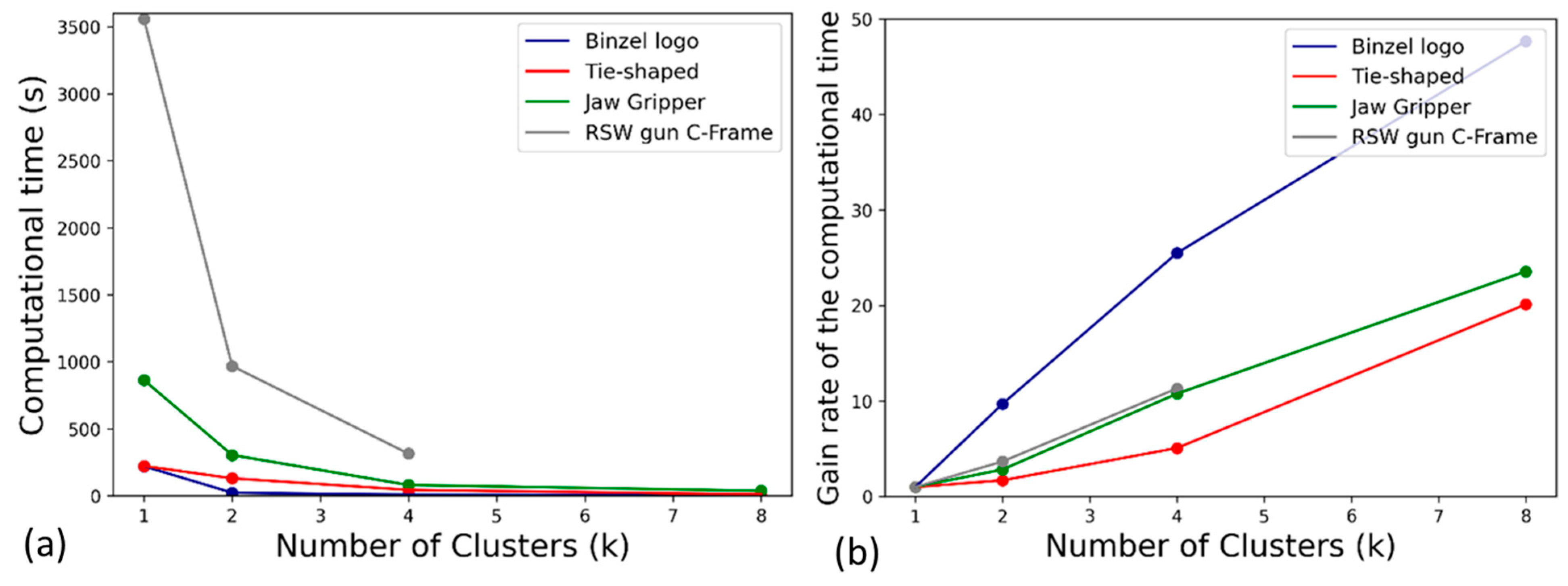 Figure 9b, it can be seen that more clusters, and thus smaller clusters, produce greater computational time gains. Larger clusters require longer processing, while smaller clusters reduce this burden, amplifying the differences in computational times. However, extremely high