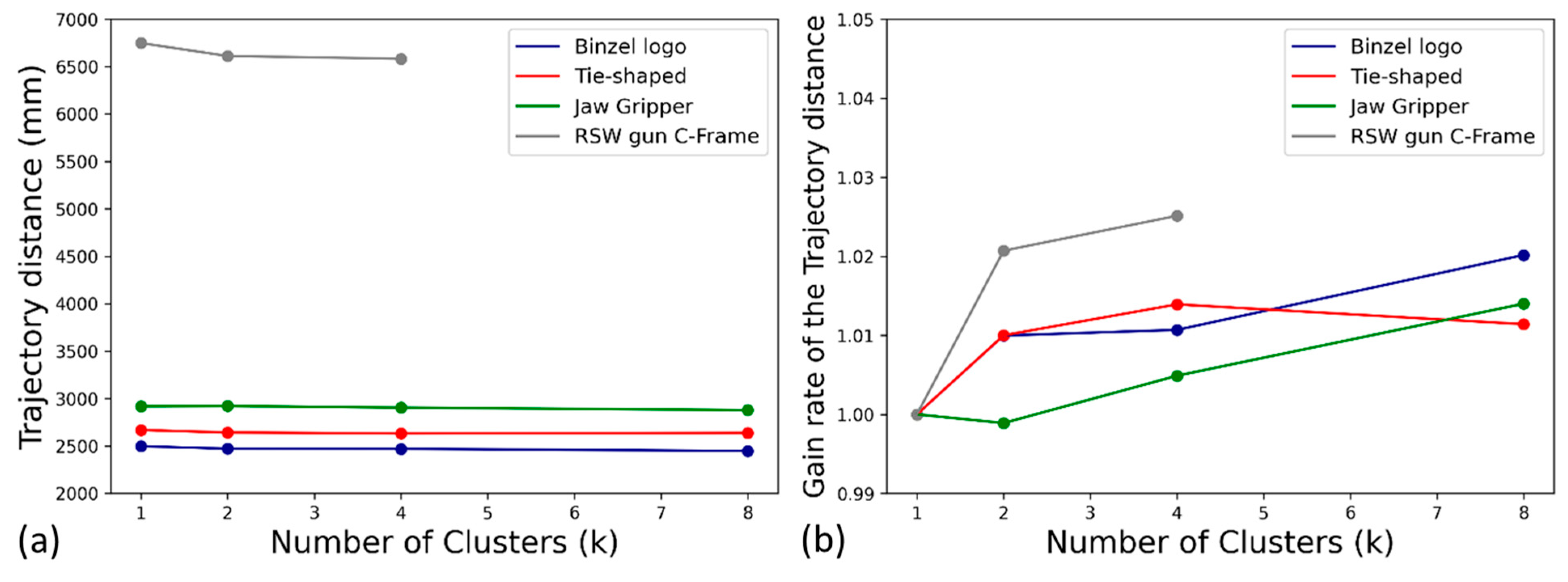 Figure 10a presents the trajectory distance for all parts across different clustering values, while