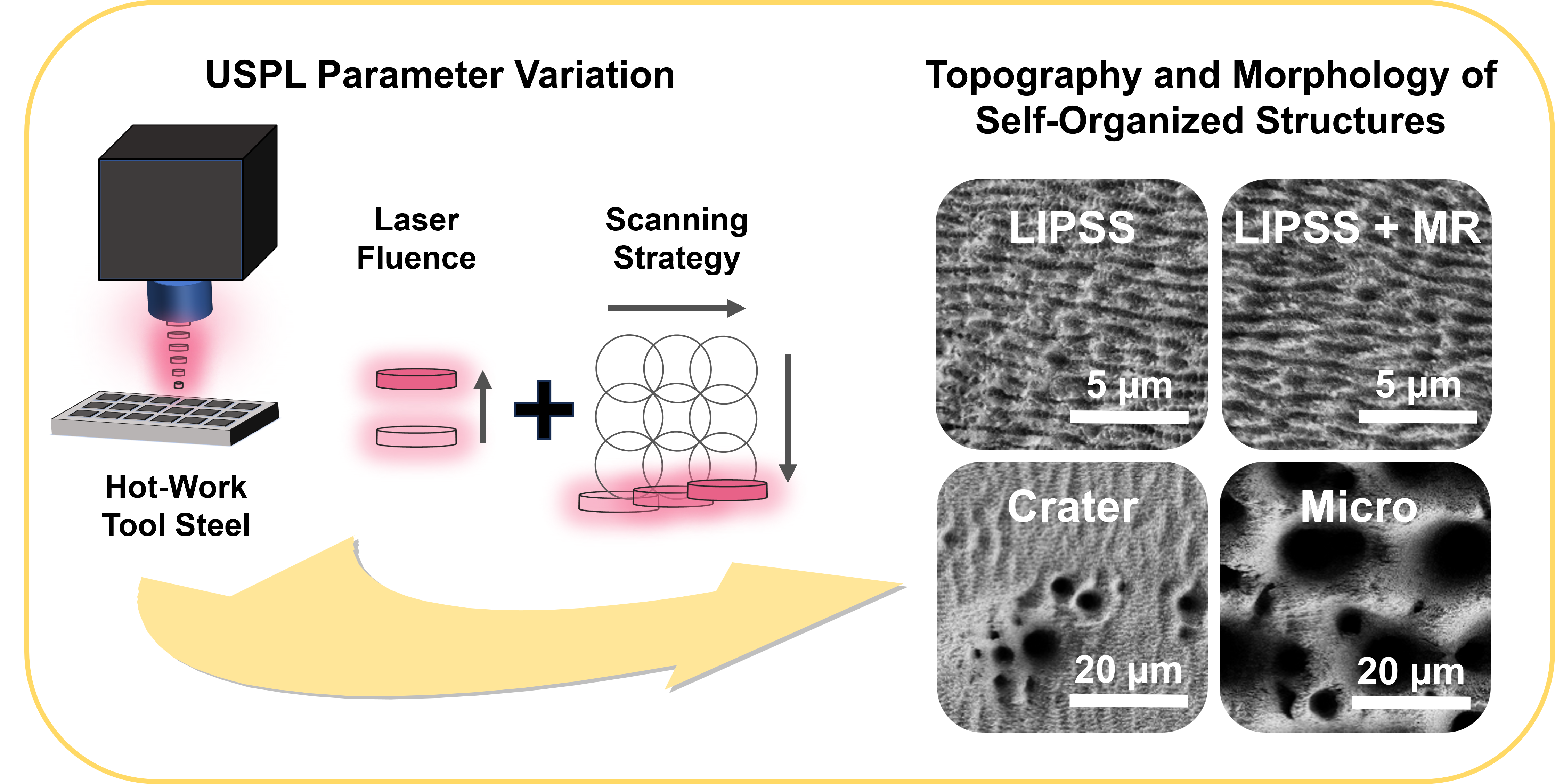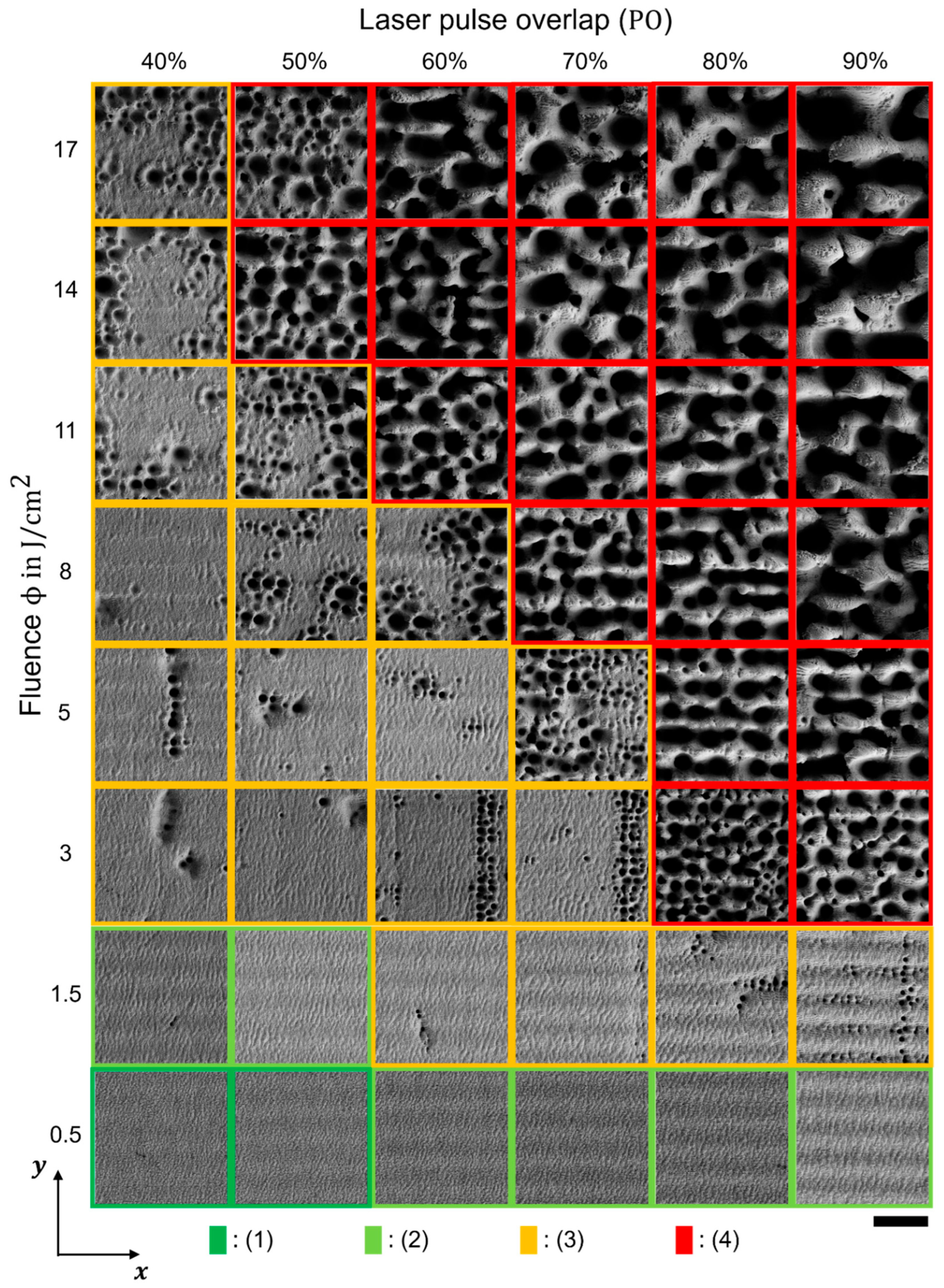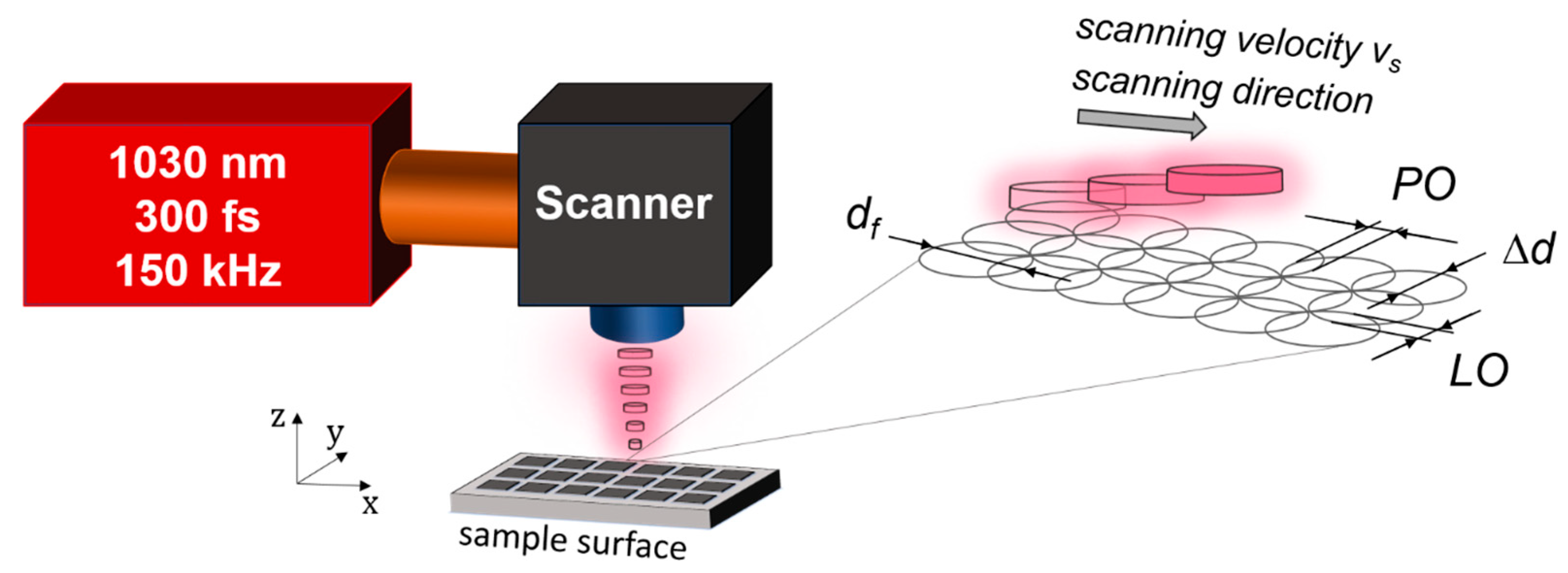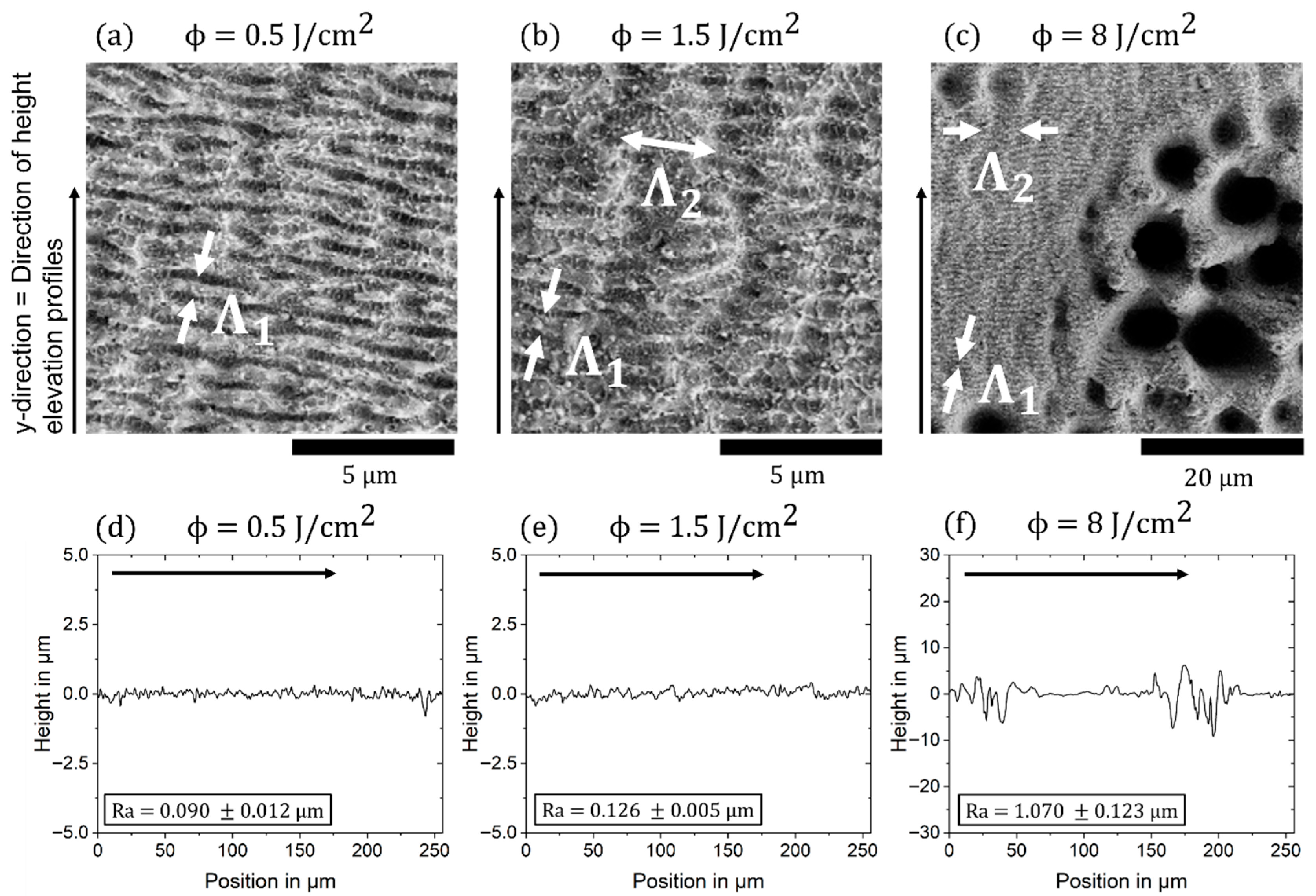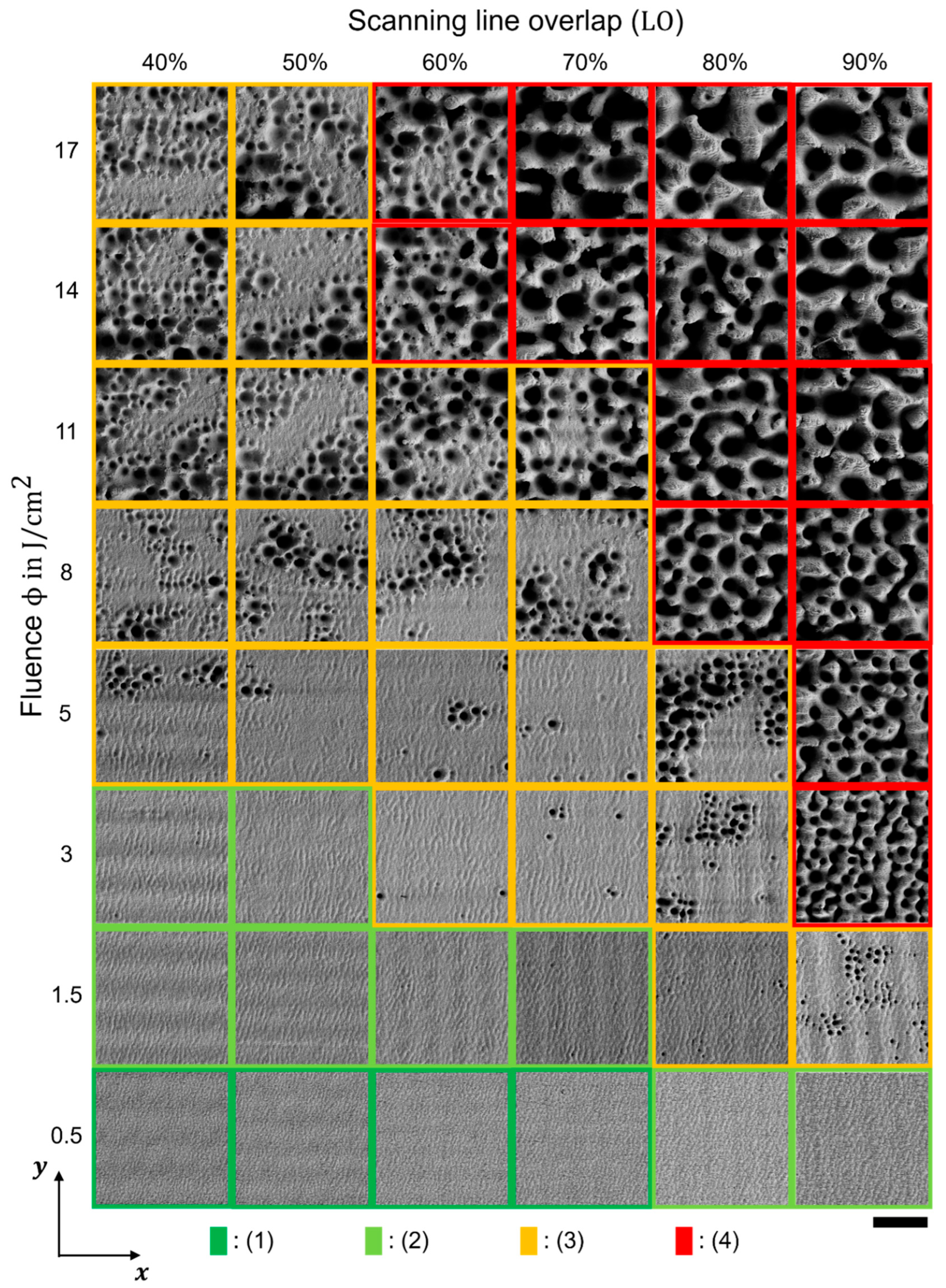 - All investigated laser parameters and scanning strategies have a significant influence on the generation of the self-organized, laser-induced surface structures. It was shown that the strong ablation threshold depends on the laser pulse overlap, the scanning line overlap, as well as on the fluence.