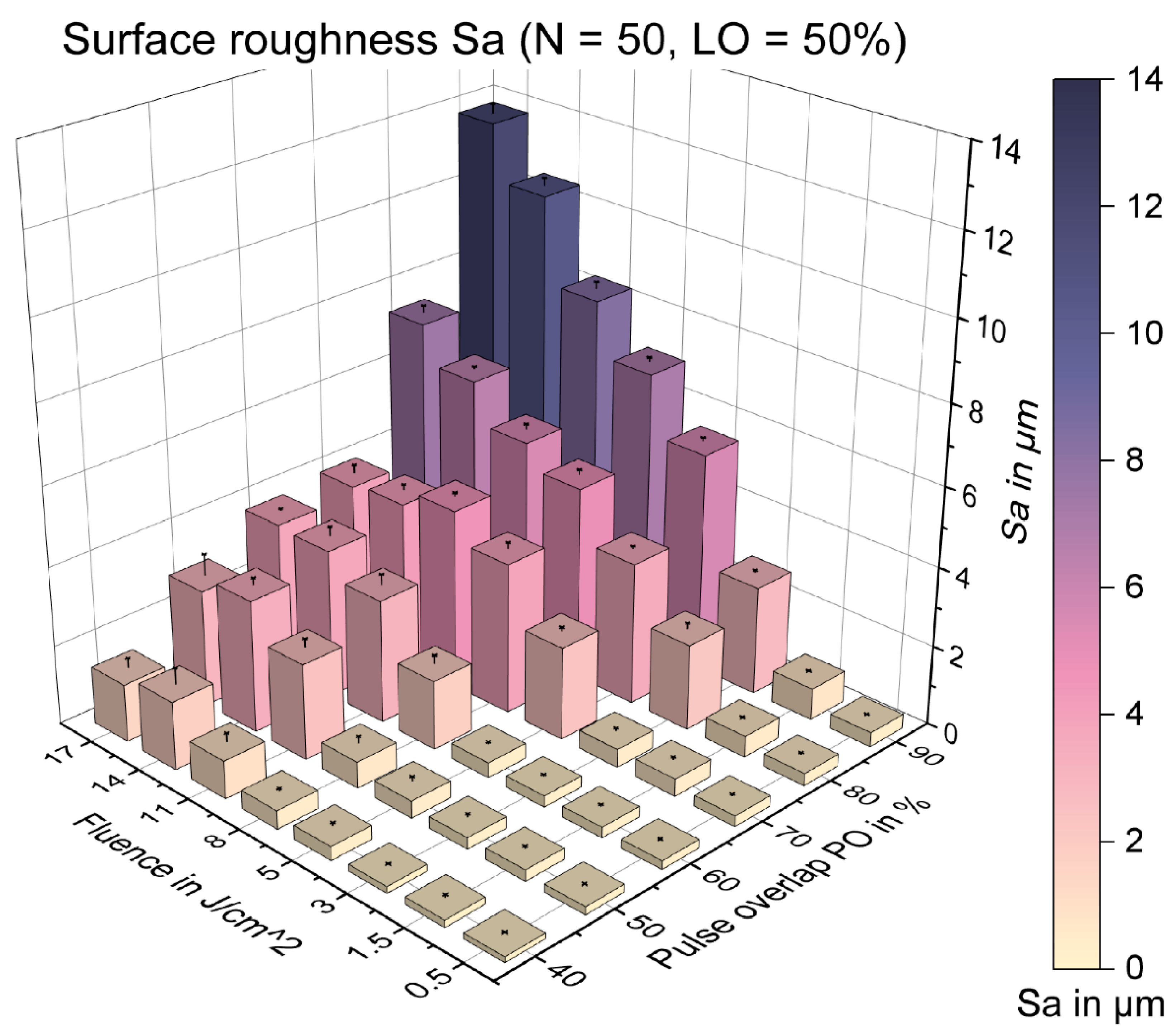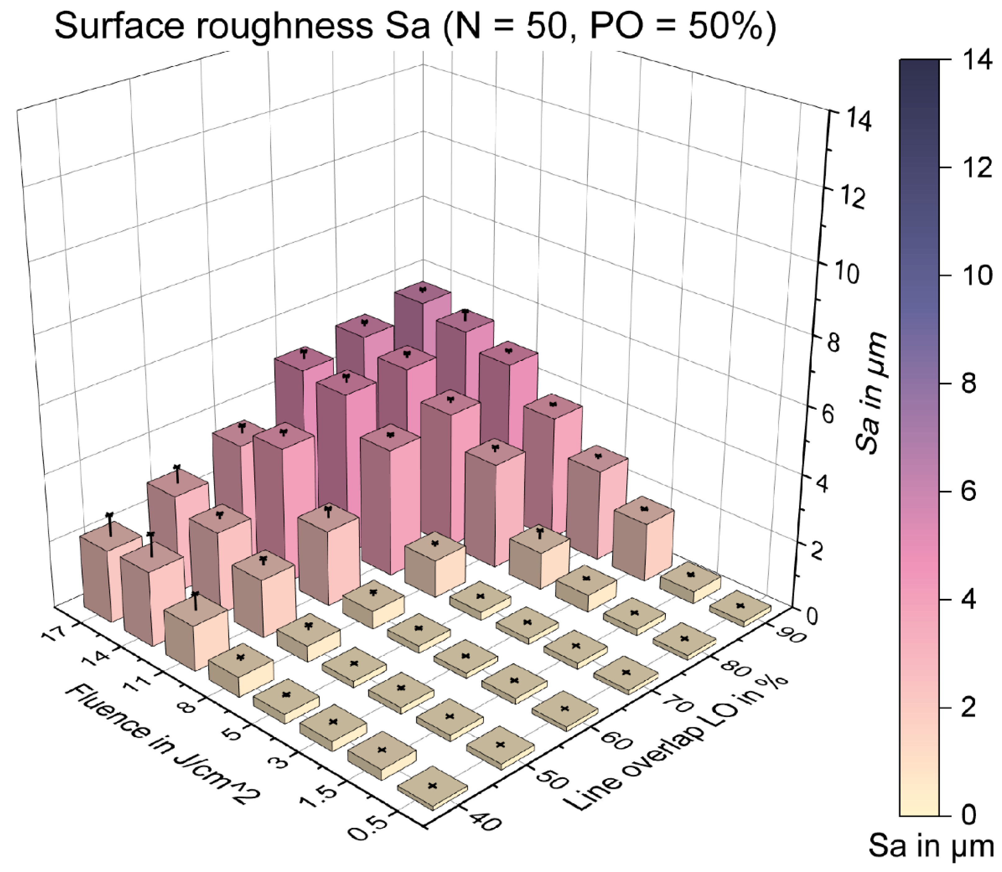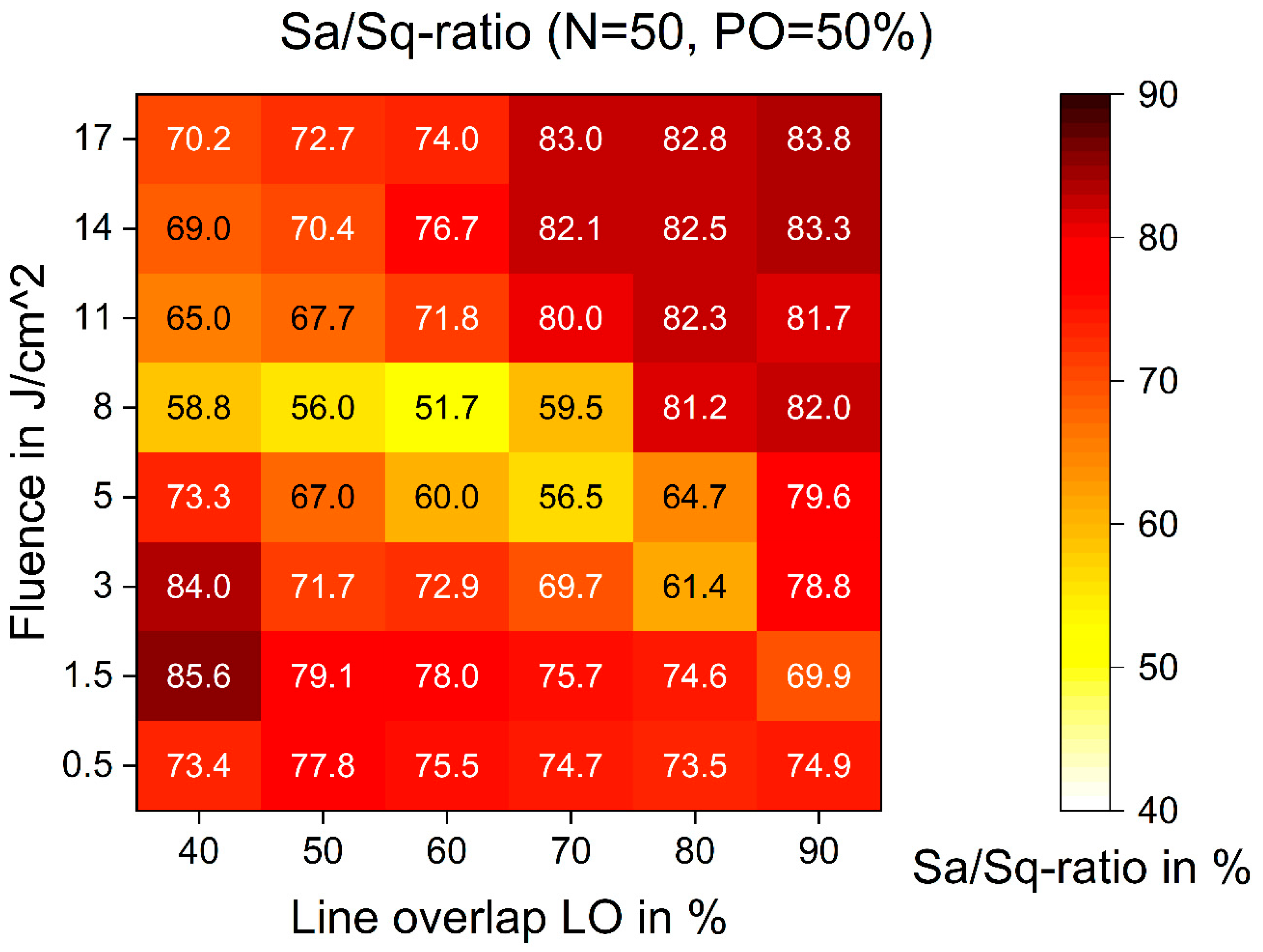 - The calculation of the Sa/Sq ratio revealed differences in surface homogeneity exceeding 30% between the resulting surface structures, depending on the applied structuring parameters.