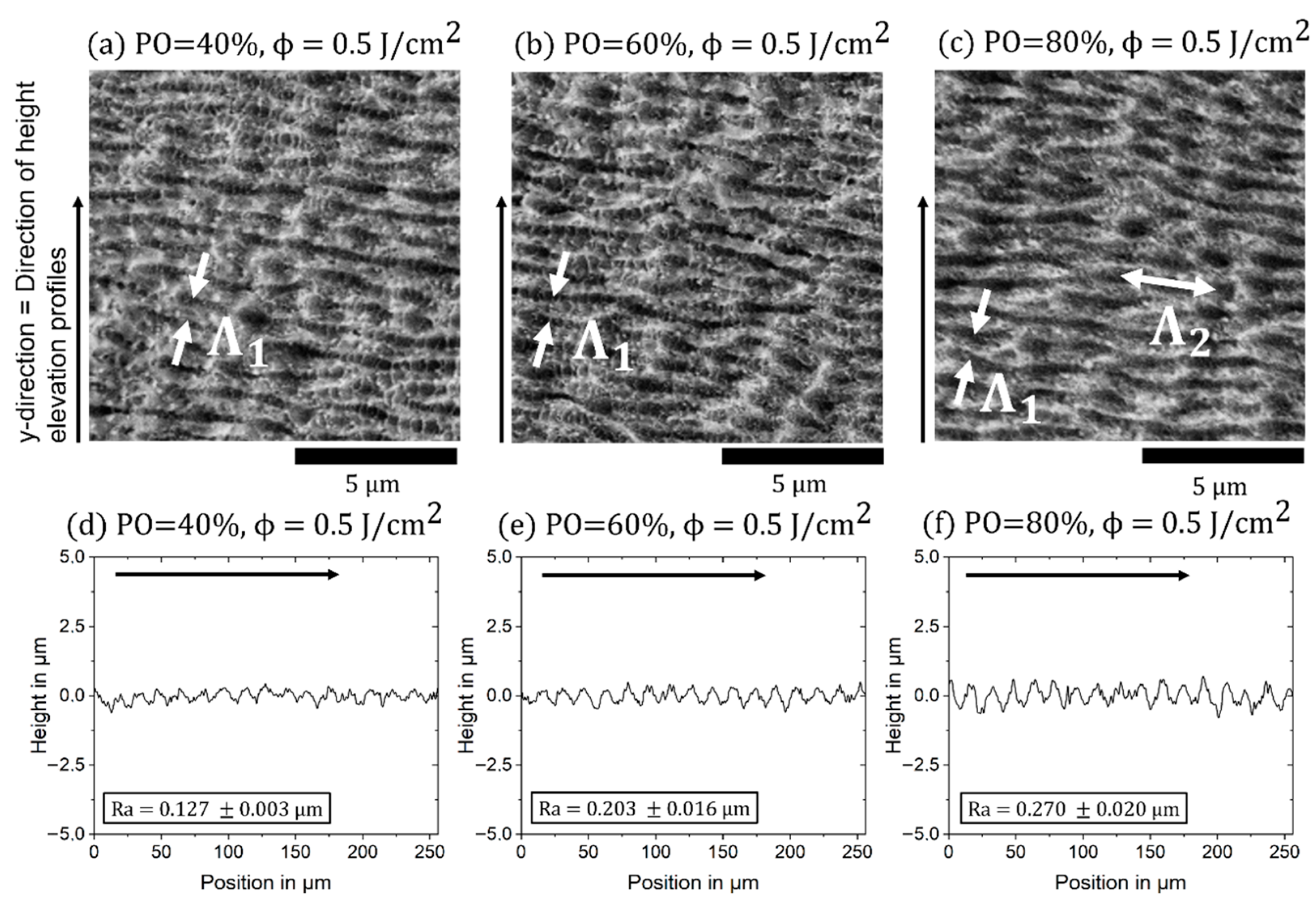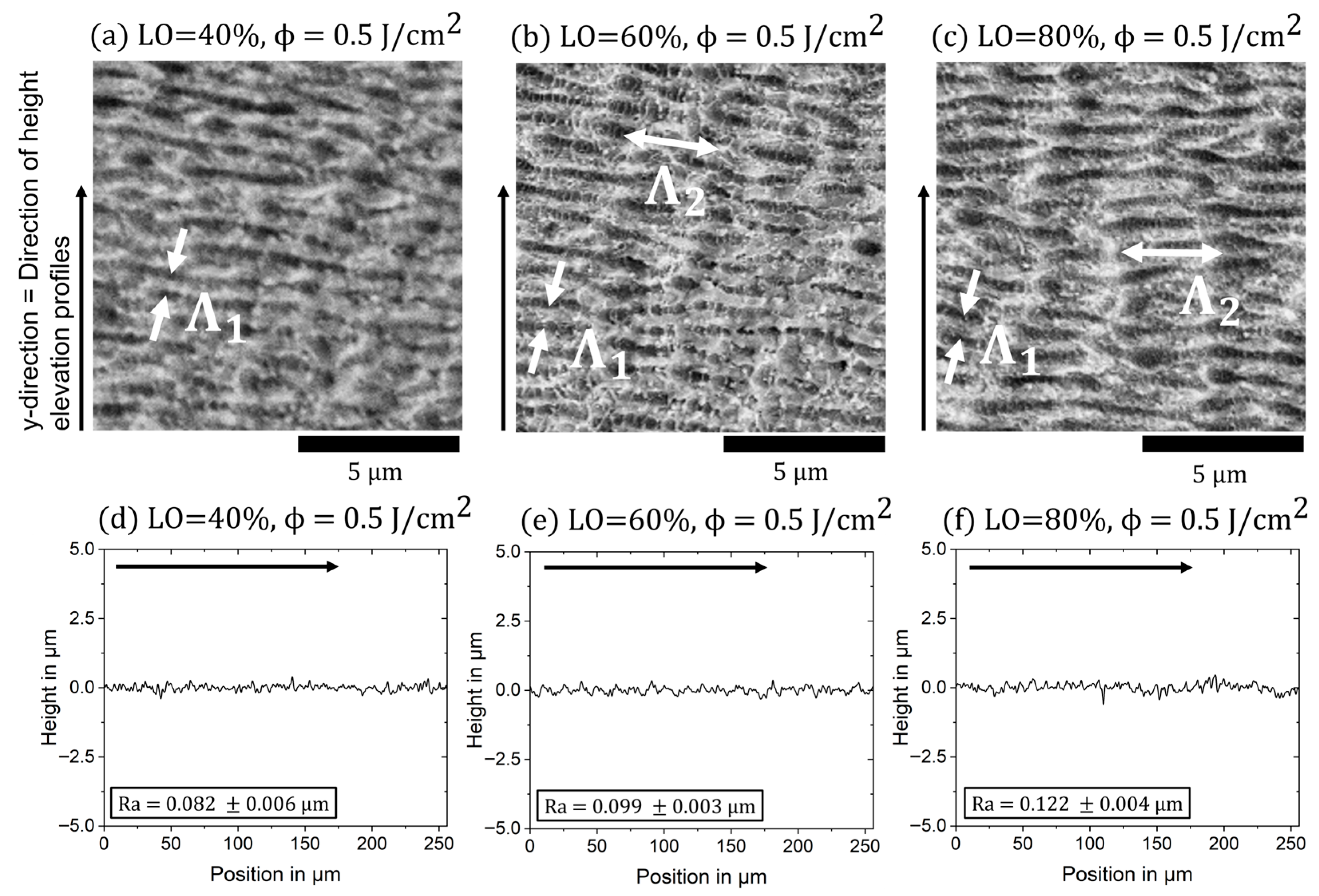 - At low fluence levels, higher scanning line overlap promotes a more homogenous formation of nanostructures with reduced waviness.