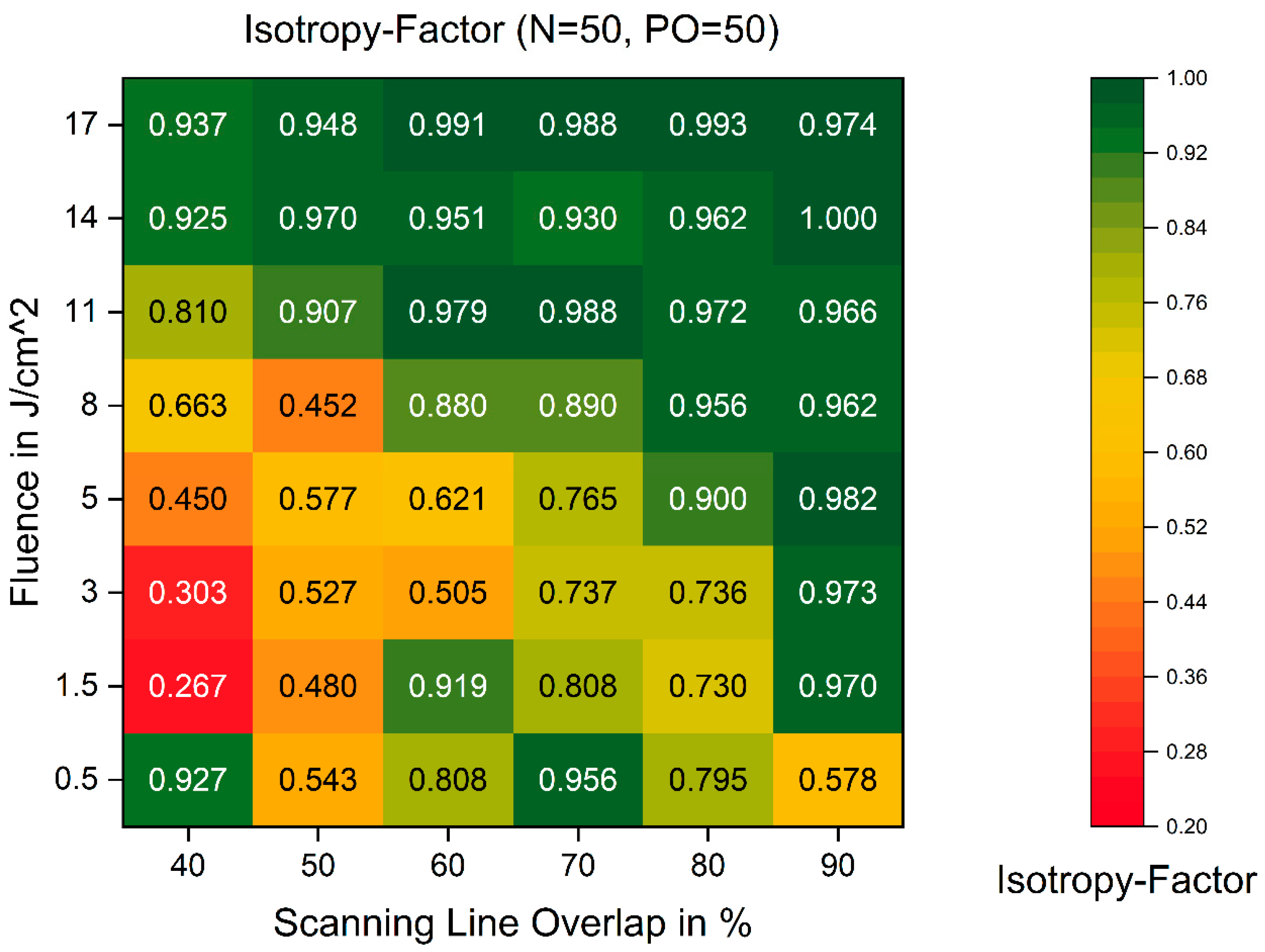 - To achieve an isotropy factor close to 1, the focus should be on the realization of nano- and self-organized microstructures. Crater structures that result in higher surface anisotropy should be avoided. For microstructures, isotropic structures are created in the fluence range of , for all laser pulse overlaps and scanning line overlaps. At lower fluences, relatively high pulse and line overlaps (PO and LO) are preferable to obtain nanostructured surfaces that are as isotropic as possible, aside from the inherent alignment characteristic of LIPSS. To achieve relatively isotropic nanostructured surfaces, the isotropy factor is an important metric, since changes in processing parameters can otherwise result in highly directional structures.