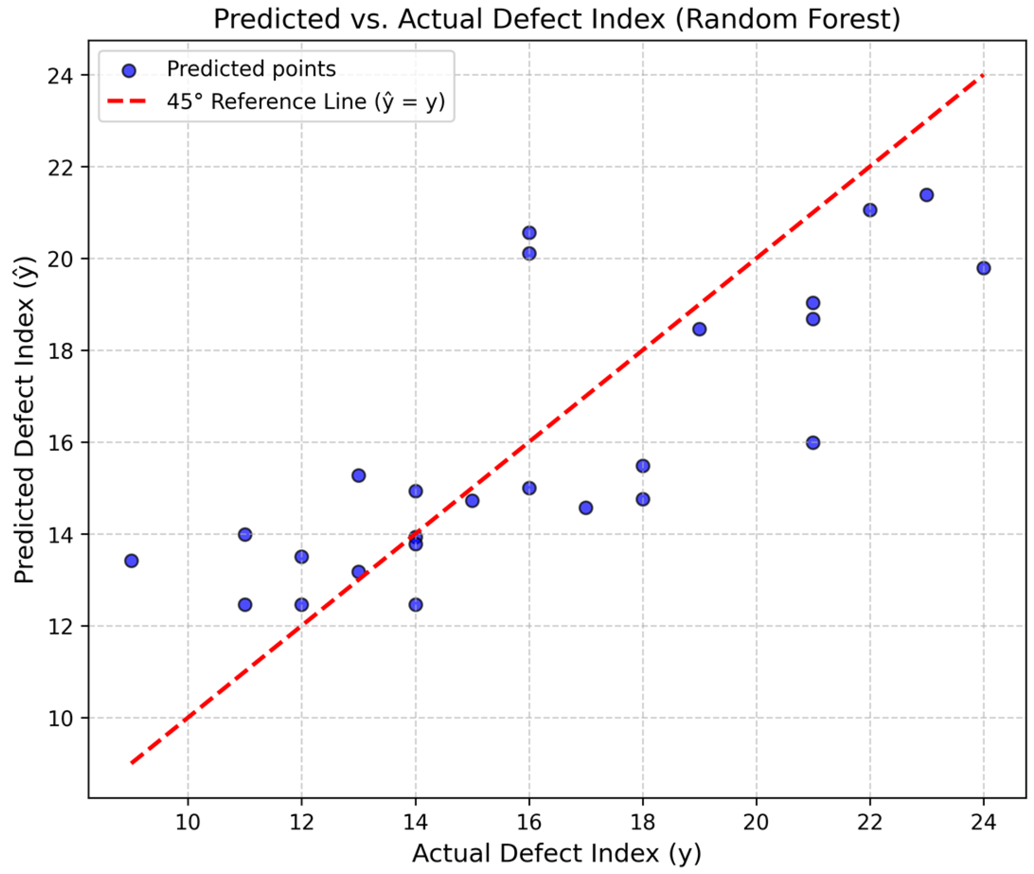 Figure 4 presents the predicted versus actual defect index values, illustrating that the predictions are closely distributed along the 45° reference line, indicating high accuracy and generalization capability of the trained model.