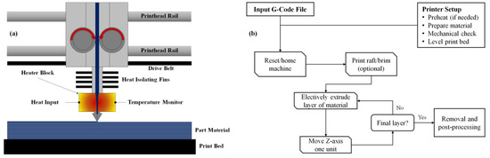 Extrusion-based additive manufacturing (AM) processes are quickly maturing into viable manufacturing technologies in their own right, providing a cost-effective and relatively simple mode for utilizing the benefits and design freedom of AM technologies. The most common and well-developed member of this production process family is commonly known as fused deposition modeling (FDM) [1]. In this process, a thermoplastic fiber or filament is extruded through a heated die and selectively deposited into a stable, flat surface in layers; the deposited material bonds with the previous layer via glass transition bonding due to the heat input of the new material [2,3,4]. The layers are designed and converted into G-code directly from computer data via pre-processing software packages such as Cura®, Repetier Host®, or ReplicatorG®. Before the process begins, it is necessary to set up the machine, which often includes pre-heating the extruder and print bed (if the machine utilizes a heated bed) to stabilize the machine and flow properties of the polymer material before printing begins. This ensures more consistent properties and prevents problems with clogs and extrusion gaps [3,4,5]. The basic process map and algorithm are demonstrated in Figure 1.
