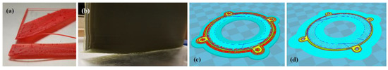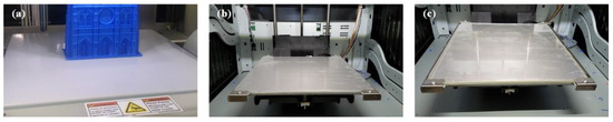 Many of the early configurations for FDM used simple build surfaces that were not heated or optimized for specific FDM materials. Many of the early FDM machines had wood, perfboard, thin glass, or acrylic build plates, but all of these were susceptible to warping and poor material adhesion. Recent technology developments have settled into using primarily tempered glass or heated aluminum build plates (Figure 3a,b) [26,27,28,29,30,31].