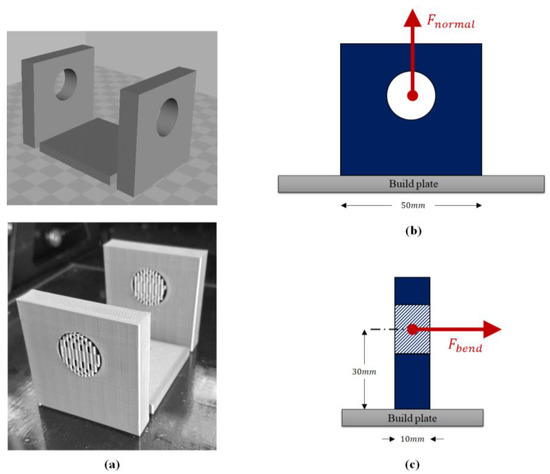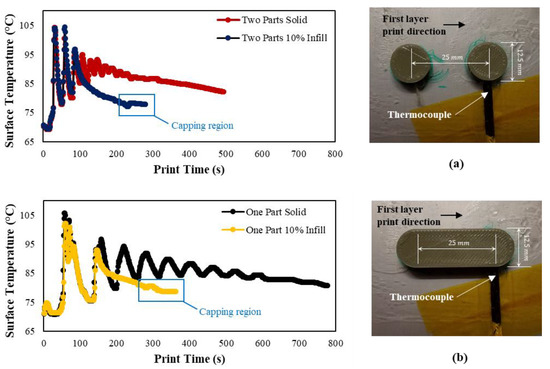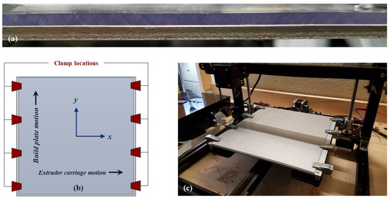 There are many ways to affix the polycarbonate and aluminum together during printing, so this is not a serious concern as long as the materials are in contact during the heating of the polycarbonate bed. The authors used eight small spring-loaded clamps throughout this study to allow the polycarbonate and aluminum to separate for part removal. The configuration of this clamping arrangement is shown in Figure 4b,c for the benefit of the reader. Between each run, the surfaces of the aluminum and polycarbonate were cleaned with isopropyl alcohol to ensure clean contact between the surfaces. If the user wished, the layers could be permanently bonded using some kind of thermal epoxy, but this may reduce the usefulness of the bed and make it much more difficult to replace the polycarbonate surface if it becomes damaged or worn during use.