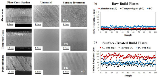 Results of the build plate surface profile characterization study, where (a,b) show the surface roughness of untreated plates and (a,c) show the roughness of the epoxy-treated surfaces.