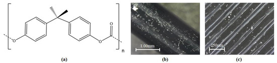 These qualities can determine the PC’s bonding strength when combined with other polymers, an important question to consider when using PC as a print bed material. Since the polycarbonate will be printed on a plate of the same material, it is reasonable to conclude that the printed part and the bed will have a very strong bond. However, this is likely dependent on interface temperature [54,55]. If the temperature reaches an appropriate point, it is predicted that the bond will be strong. Figure 6 shows the chemical structure and examples of a non-transparent PC filament and an FDM-printed surface (to demonstrate the surface texture quality of the material).